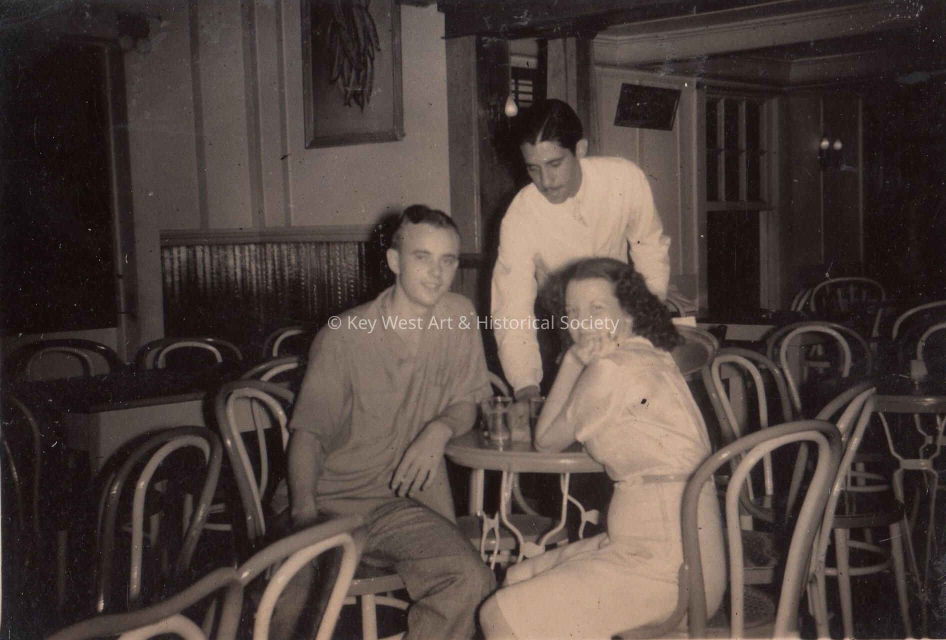 Unknown man, woman, and waiter at table at Pena's Garden of Roses Night Club, Key West.Collection