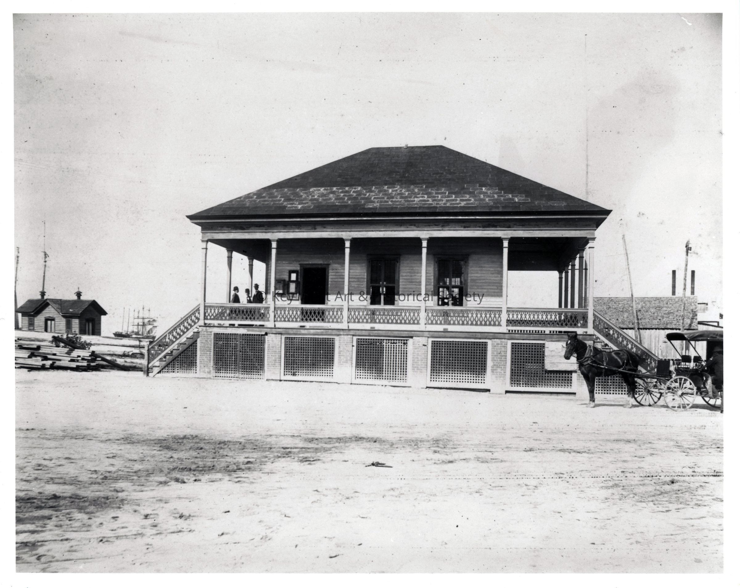 Black and white photograph of the Peninsular & Occidental Steamship office at 0 Duval Street. It was formerly the Phillinick residence and was eventually part of the Pier House Resort.