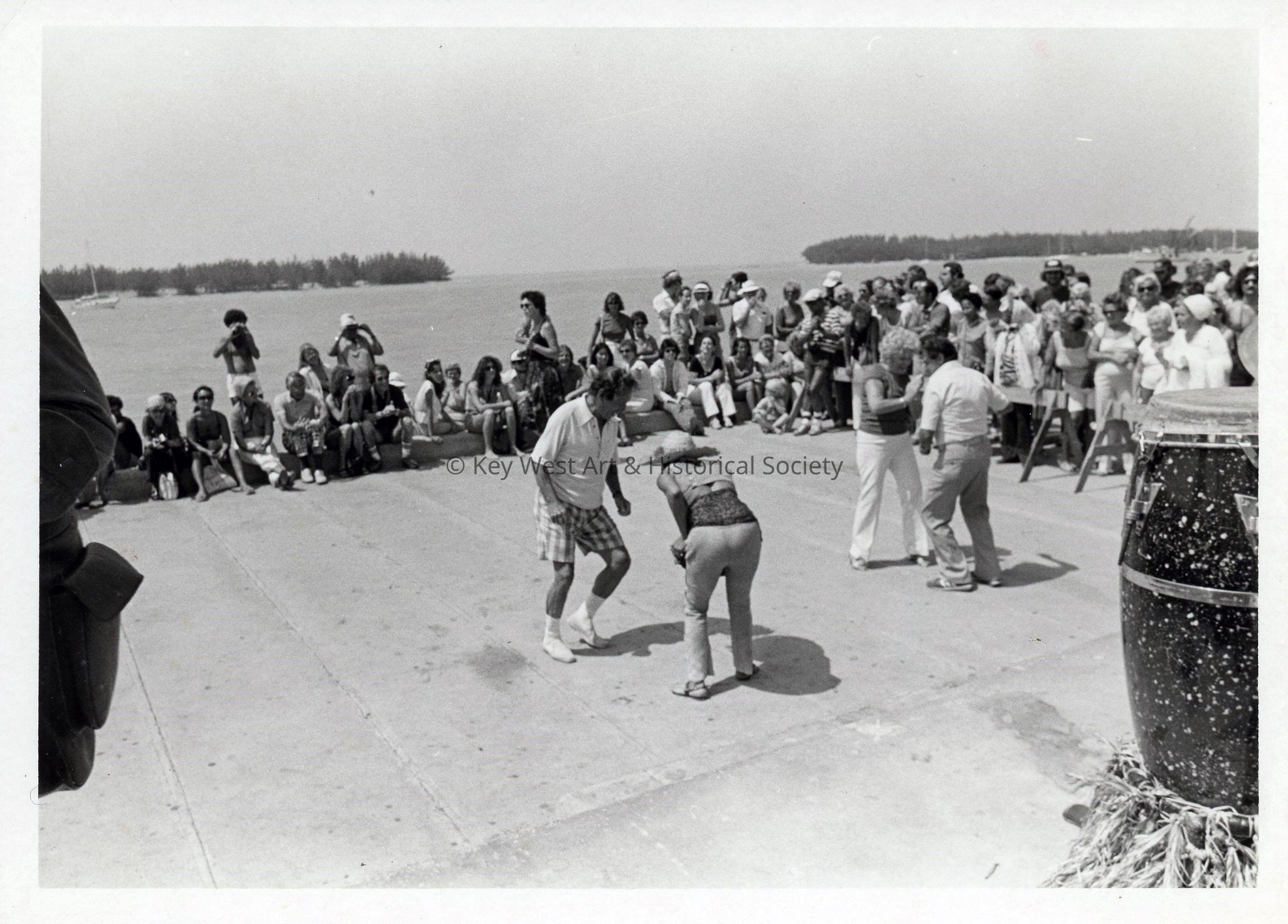 Black and white photograph of two couples dancing at Mallory Square, possibly during the Island Roots Festival.