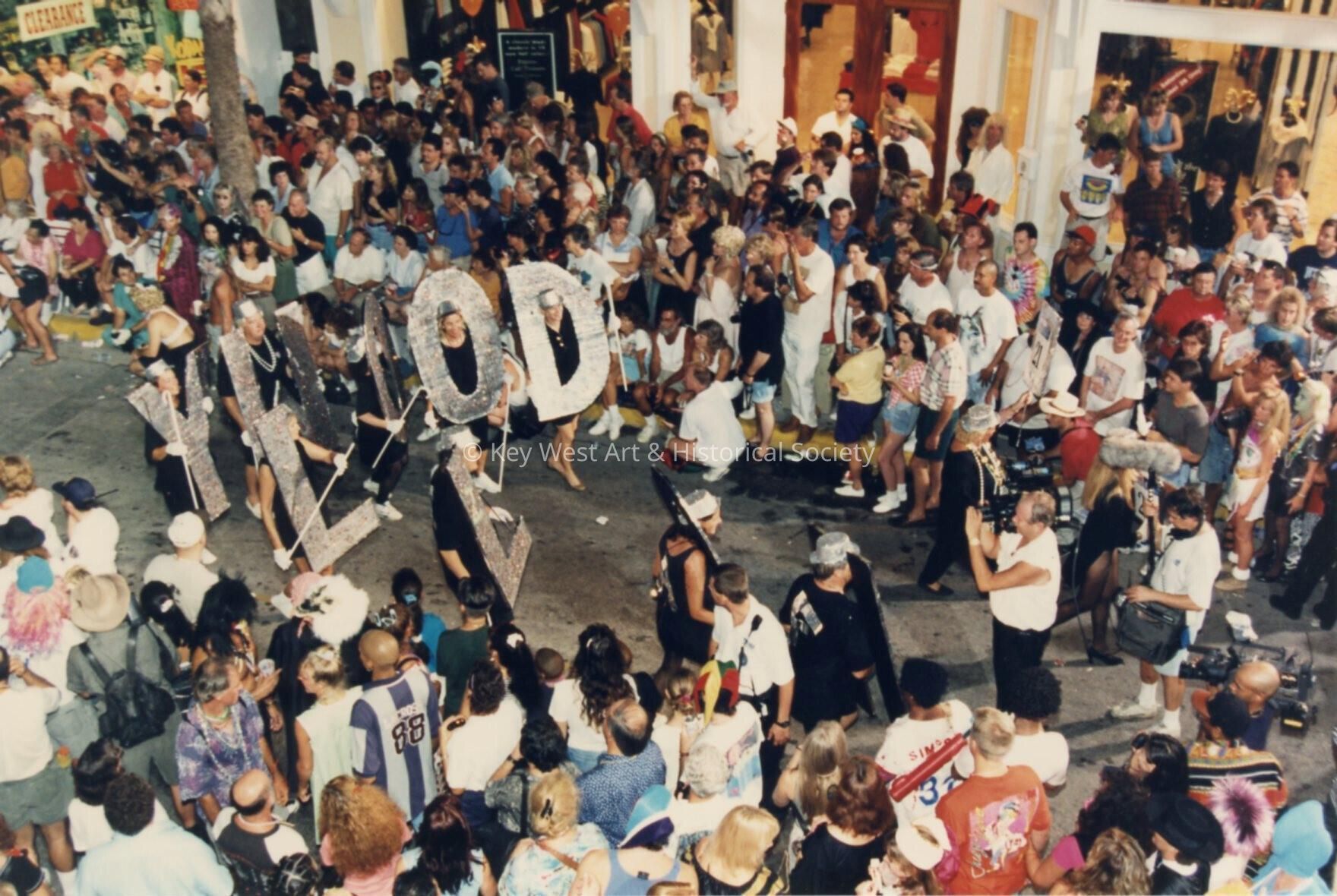 People walking in the parade dressed at the Hollywood letters.Entry/Object ID