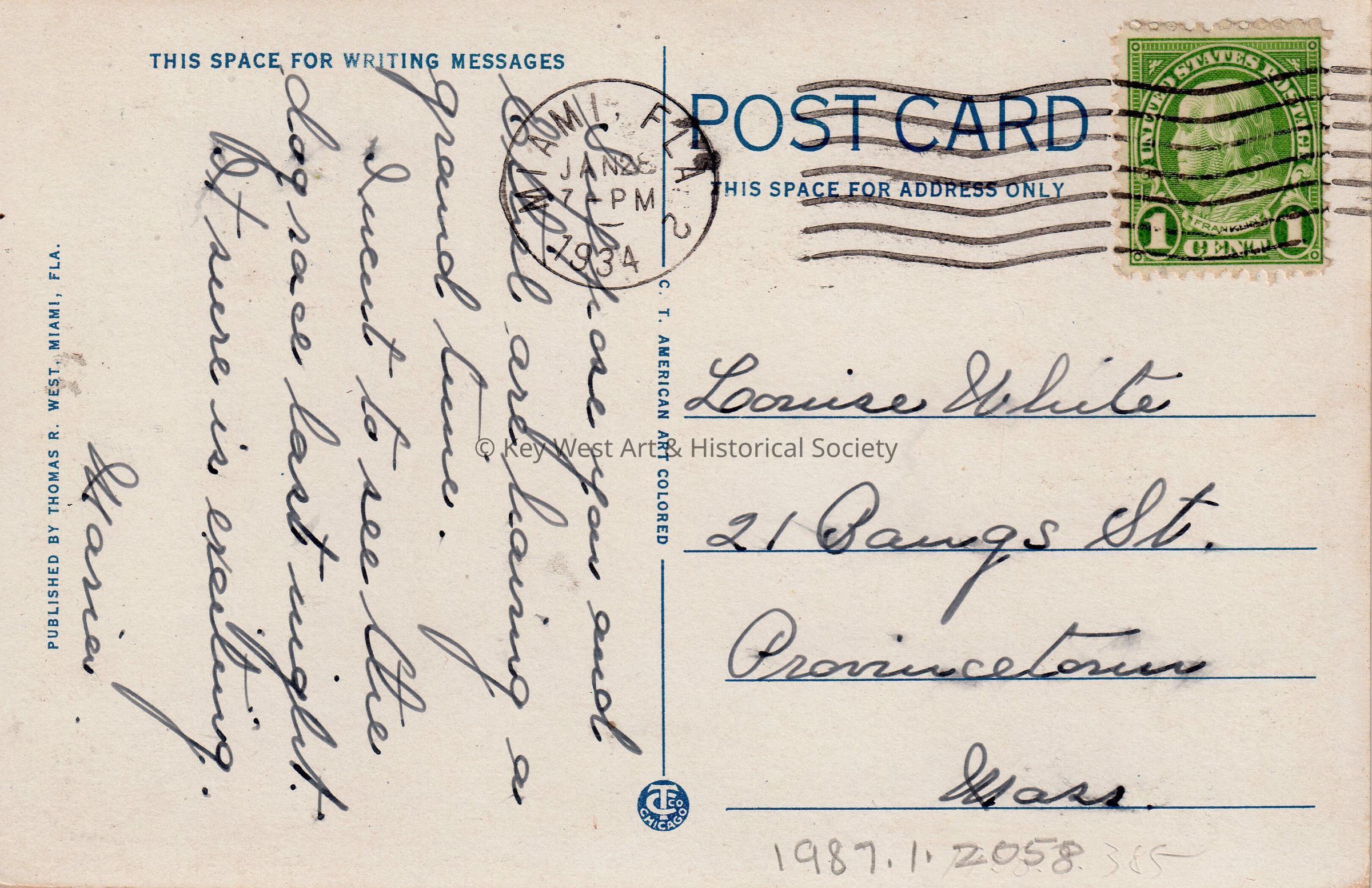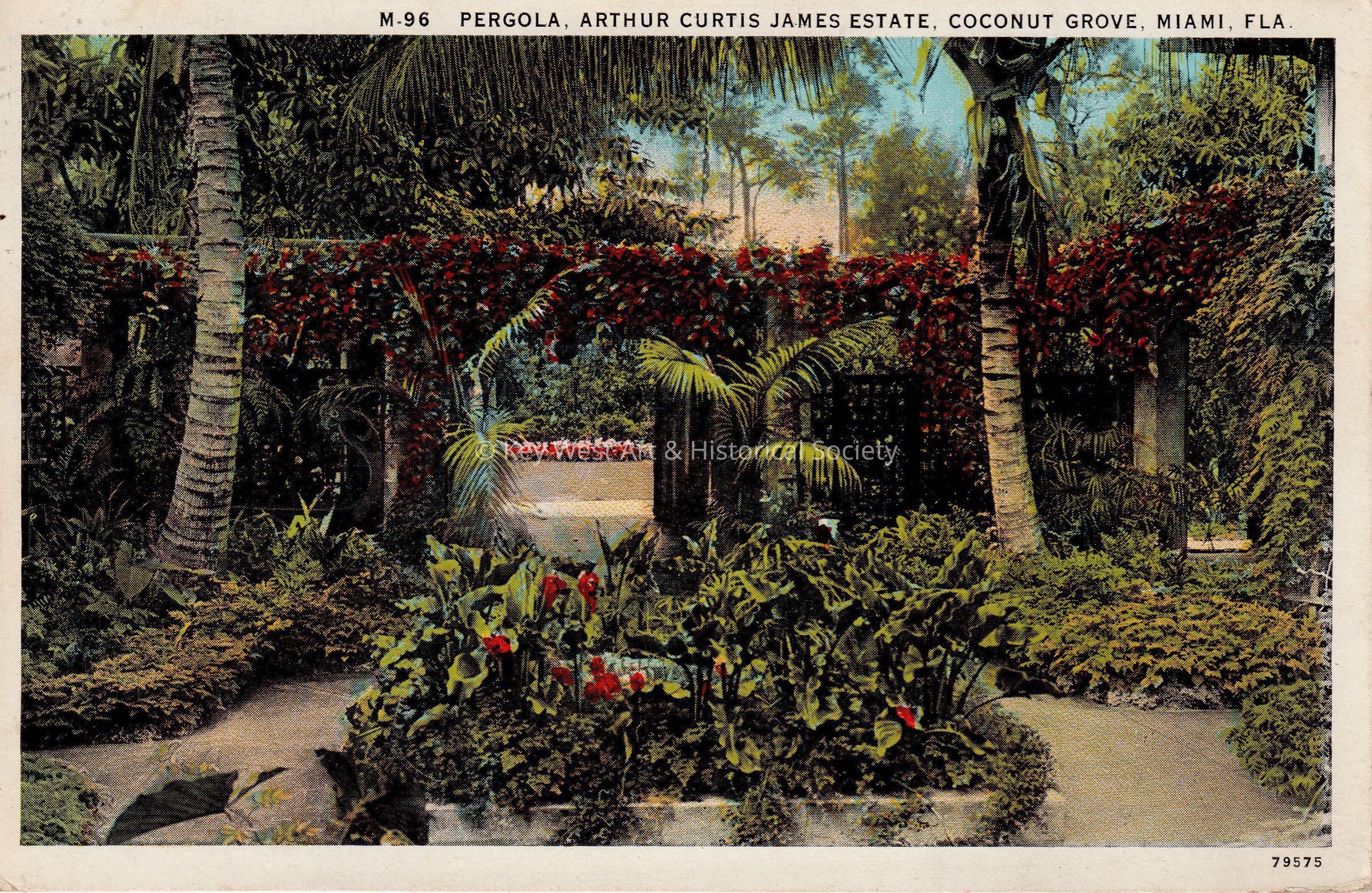 Postcard depicting a garden. The caption reads, ‘Pergola, Arthur Curtis James Estate, Coconut Grove, Miami, Florida.’ The message on the verso reads, ‘Suppose you and Ethel are having a grand time. I went to see the dog race last night. It sure is exciting. Maria.’ The card is addressed to Louise White, 21 Raugs Street, Provincetown, Massachusetts, and is postmarked Miami, January 28, 1934.Collection