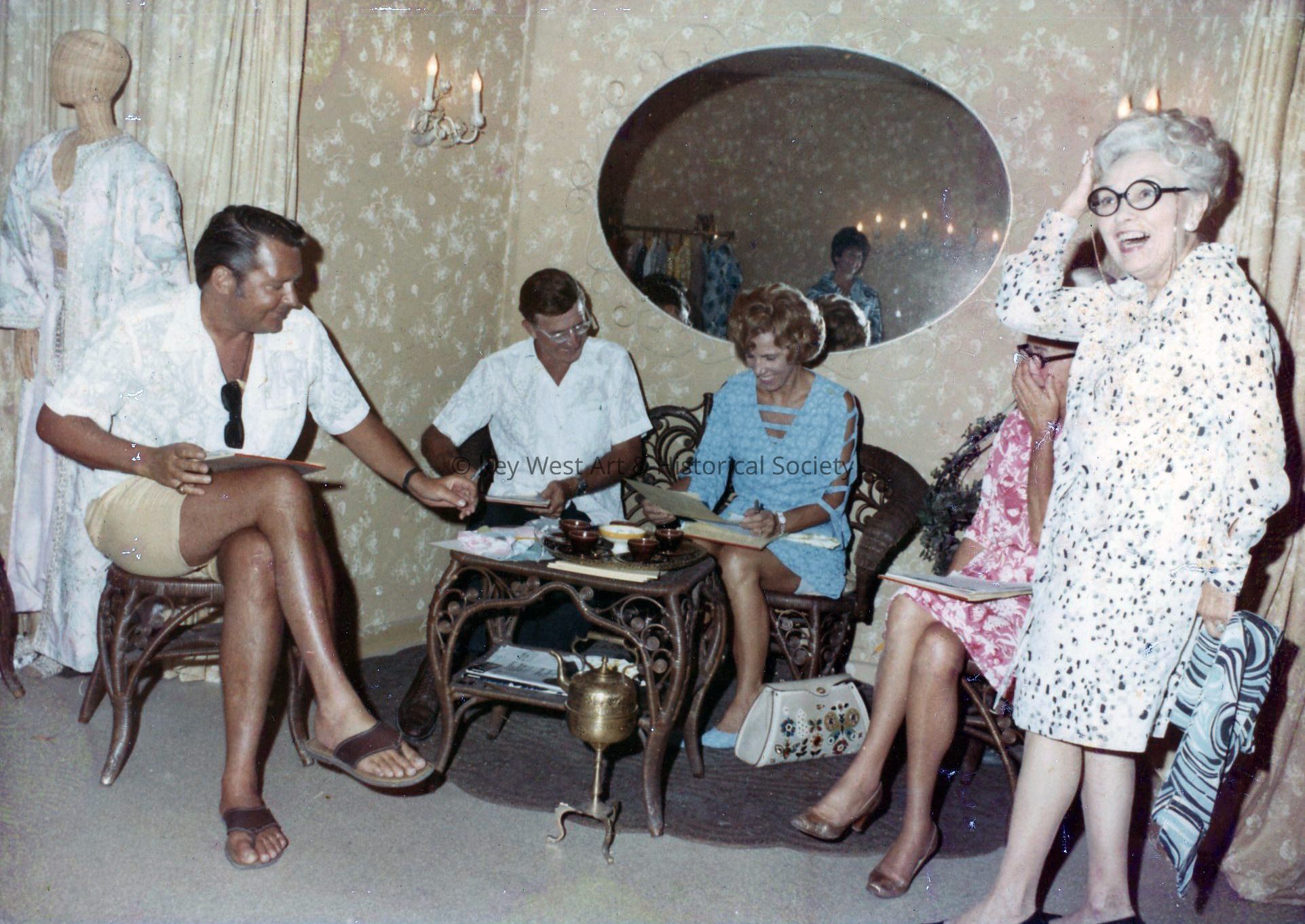 Color photograph of five people including Peter Pell (far left), possibly in the Key West Hand Print Fabrics studio. A sixth person, Jacquolyn Staubs, is seen in a mirror's reflection. To the left of Pell is a mannequin with printed fabric covering it.Photograph Details