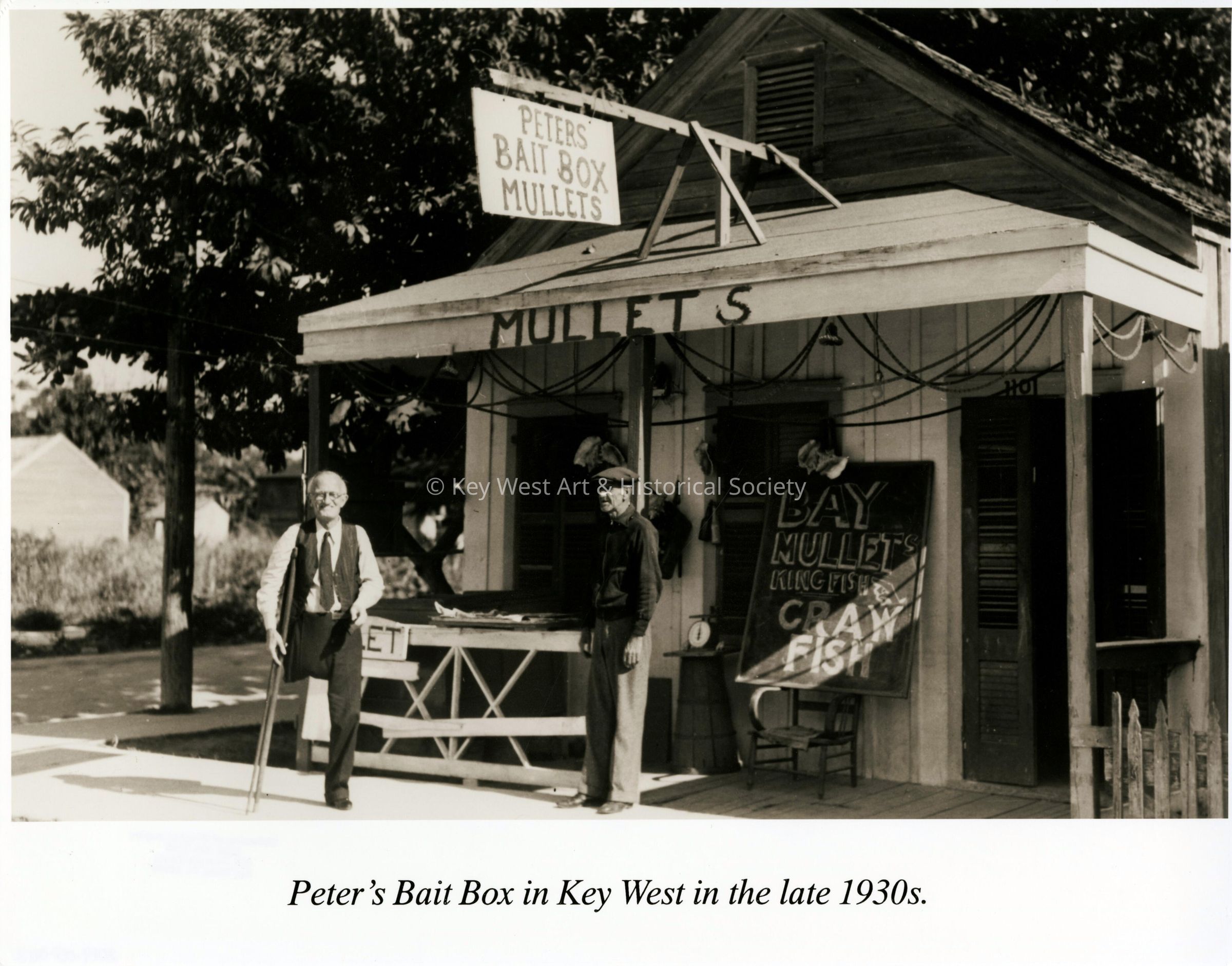 Black and white photograph of Peters Bait Box selling bay mullets, kingfish and crawfish.