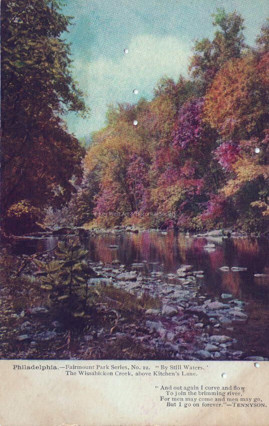 Postcard depicting a pastoral creekside scene. The caption reads, ‘Philadelphia – Fairmount Park Series, No. 10 “By Still Waters”. The Wissahickon Creek, above Kitchen’s Lane. “And out again I curve and flow, to join the brimming river, for men may come and men may go, but I go on forever.” Tennyson’.Collection
