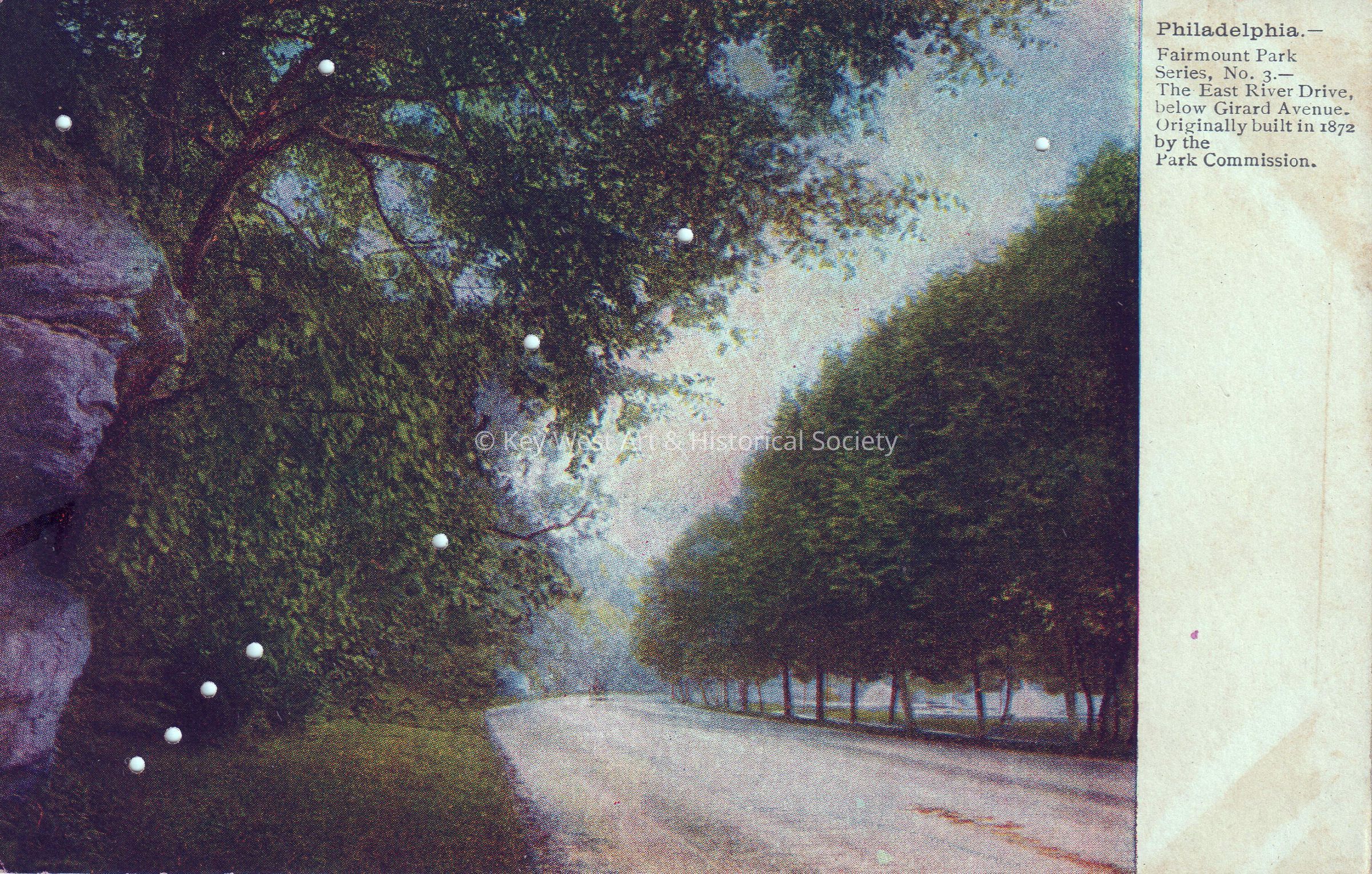 Postcard depicting a road through a park. The caption reads, ‘Philadelphia – Fairmount Park Series, No. 3 – The East River Drive, below Girard Avenue, Originally built in 1872 by the Park Commission.’Collection