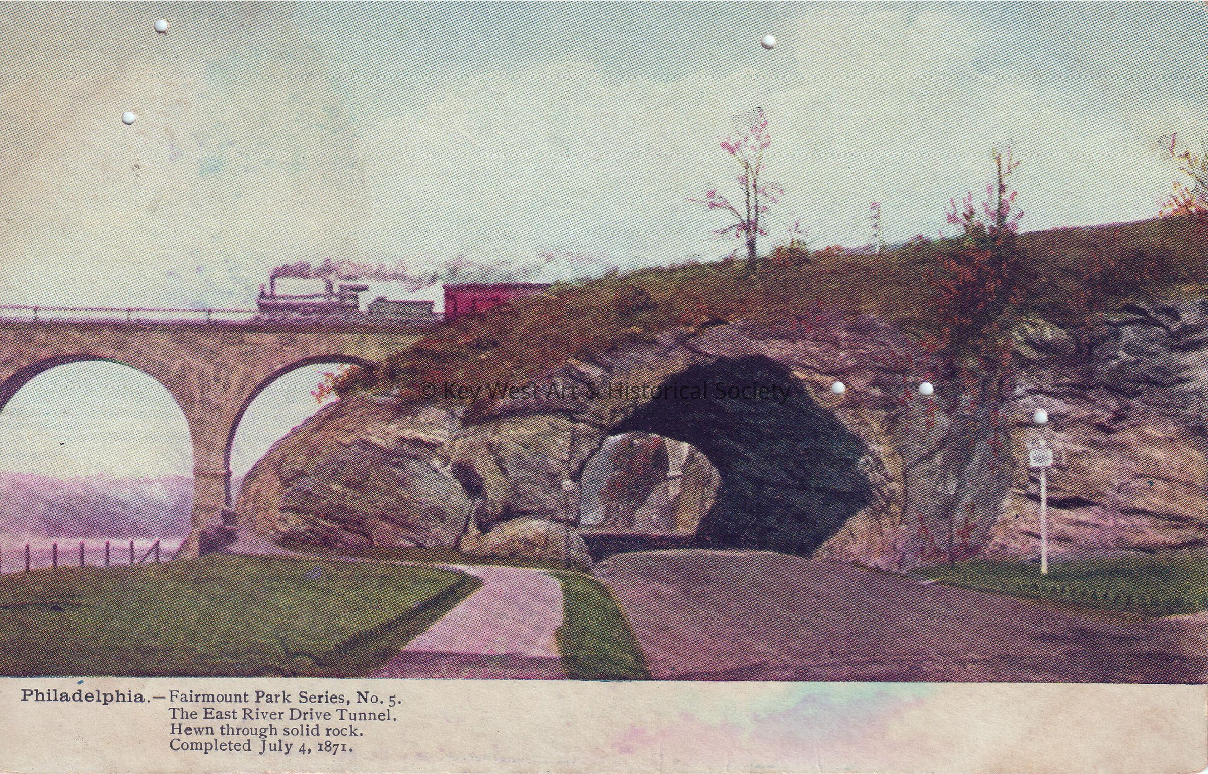 Postcard depicting a train traveling above a tunnel. The caption reads, ‘Philadelphia – Fairmount Park Series, No. 5, The East River Drive Tunnel. Hewn through solid rock, completed July 4, 1871.’Collection