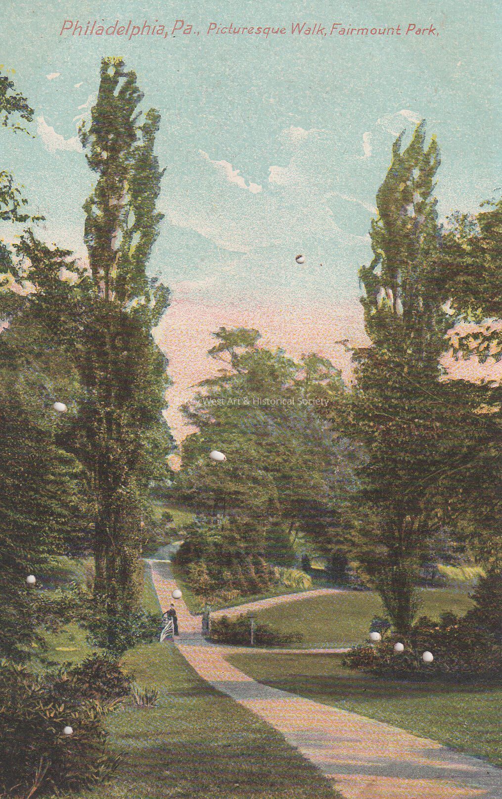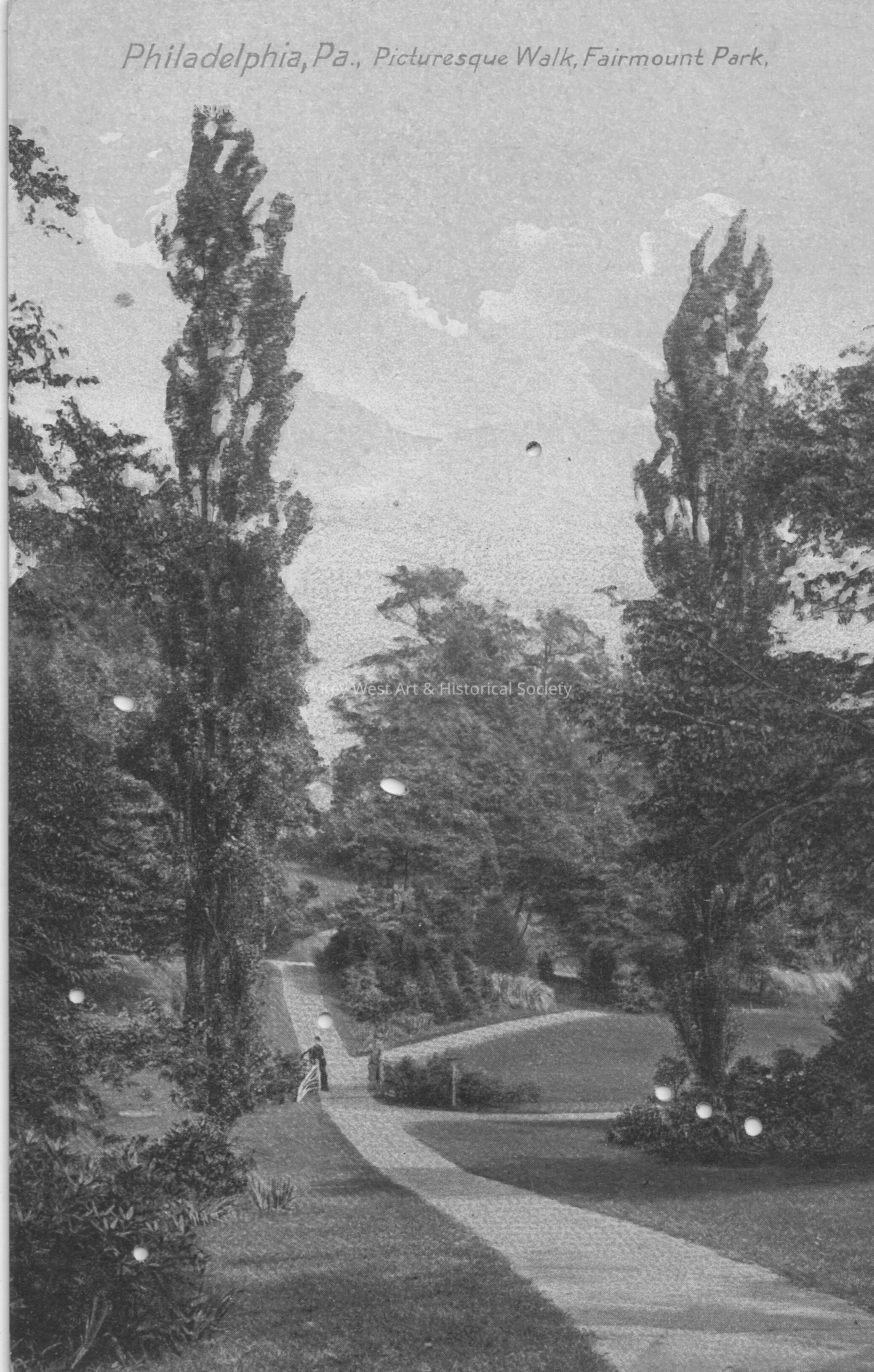 Postcard depicting a path through a park. The caption reads, ‘Philadelphia, Pennsylvania, Picturesque Walk, Fairmount Park’.Collection