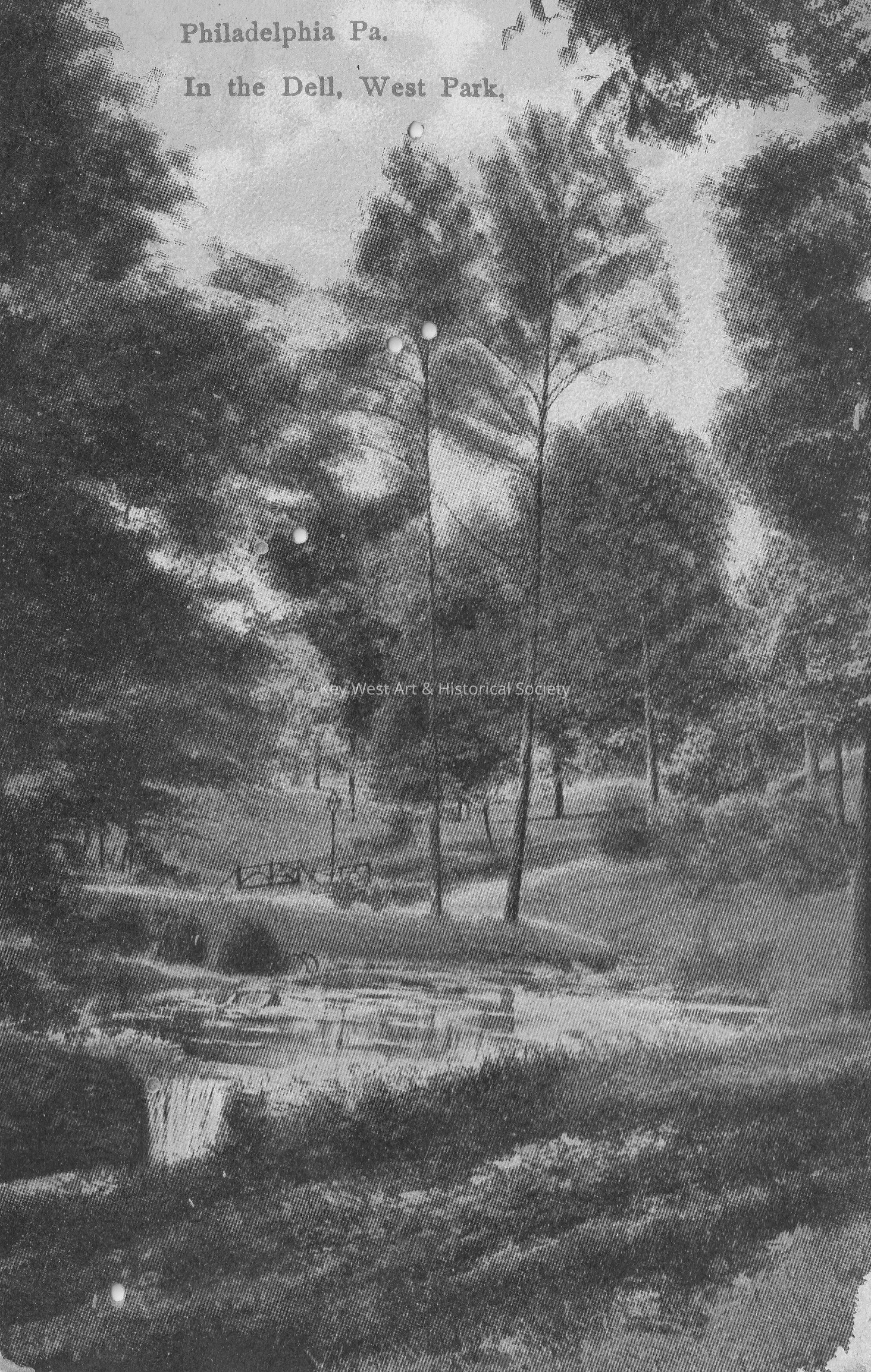 Postcard depicting a creek flowing through a park. The caption reads, ‘Philadelphia, Pennsylvania, In the Dell, West Park.’Collection