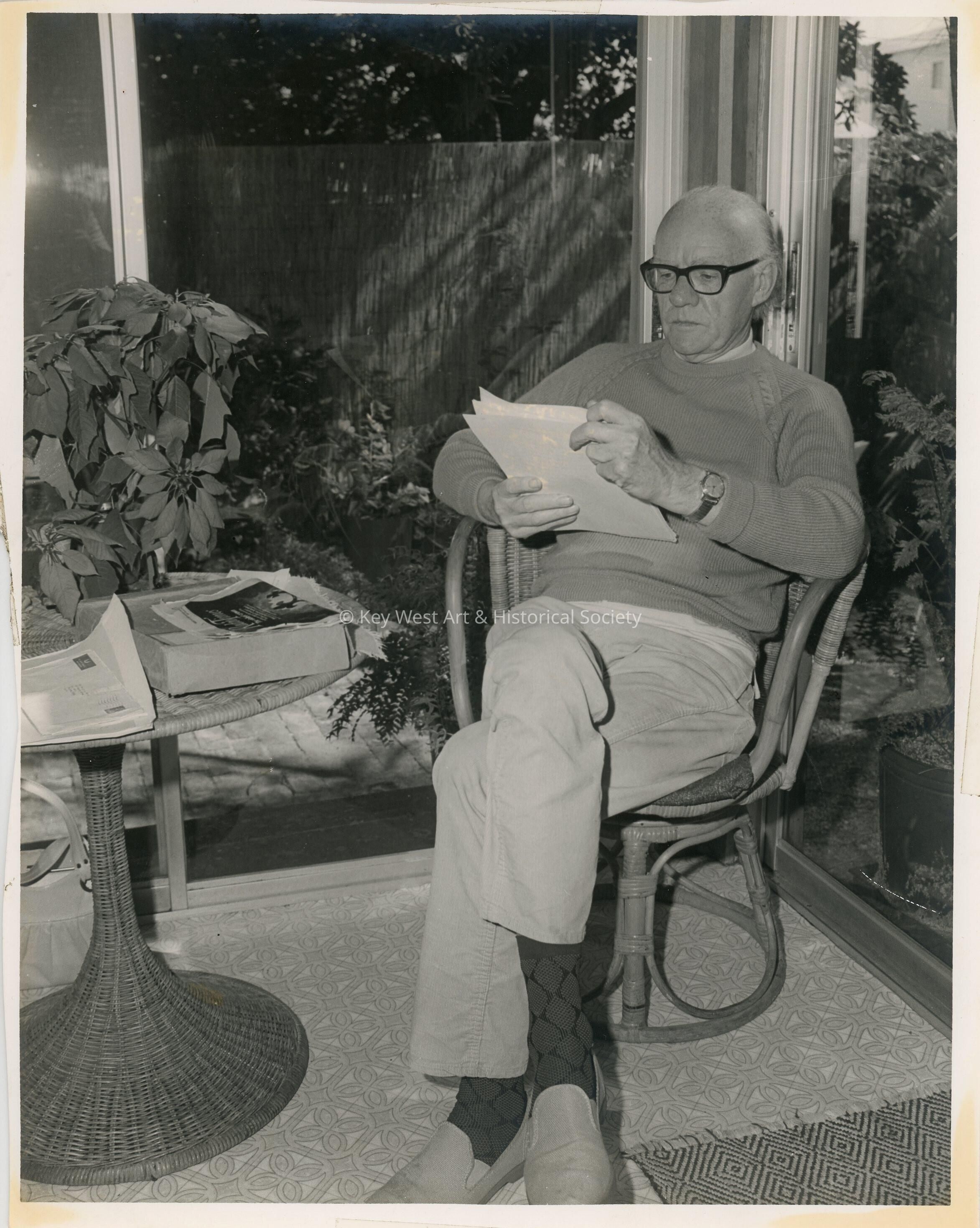Black and white photograph of Welsh theater director Philip Burton at his Key West home.