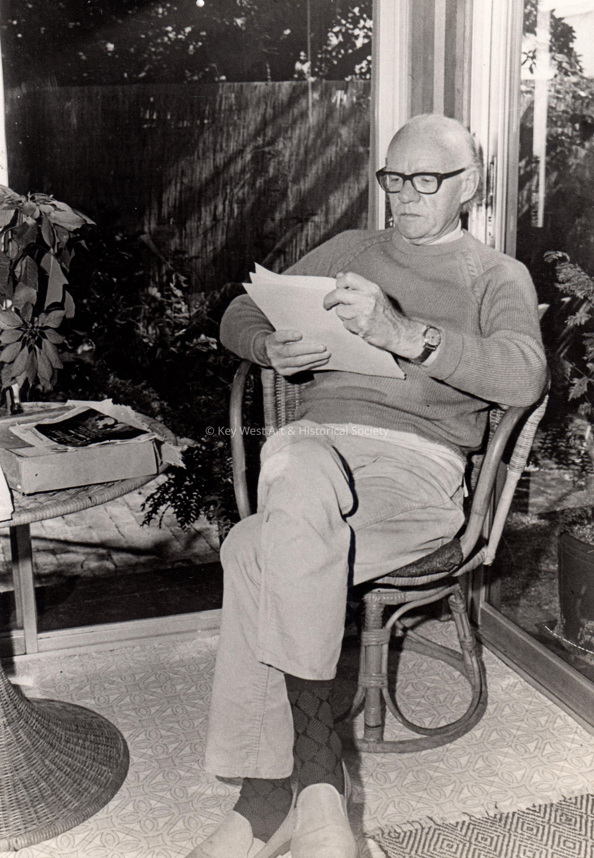 Black and white photograph of Philip Burton at his Key West home.