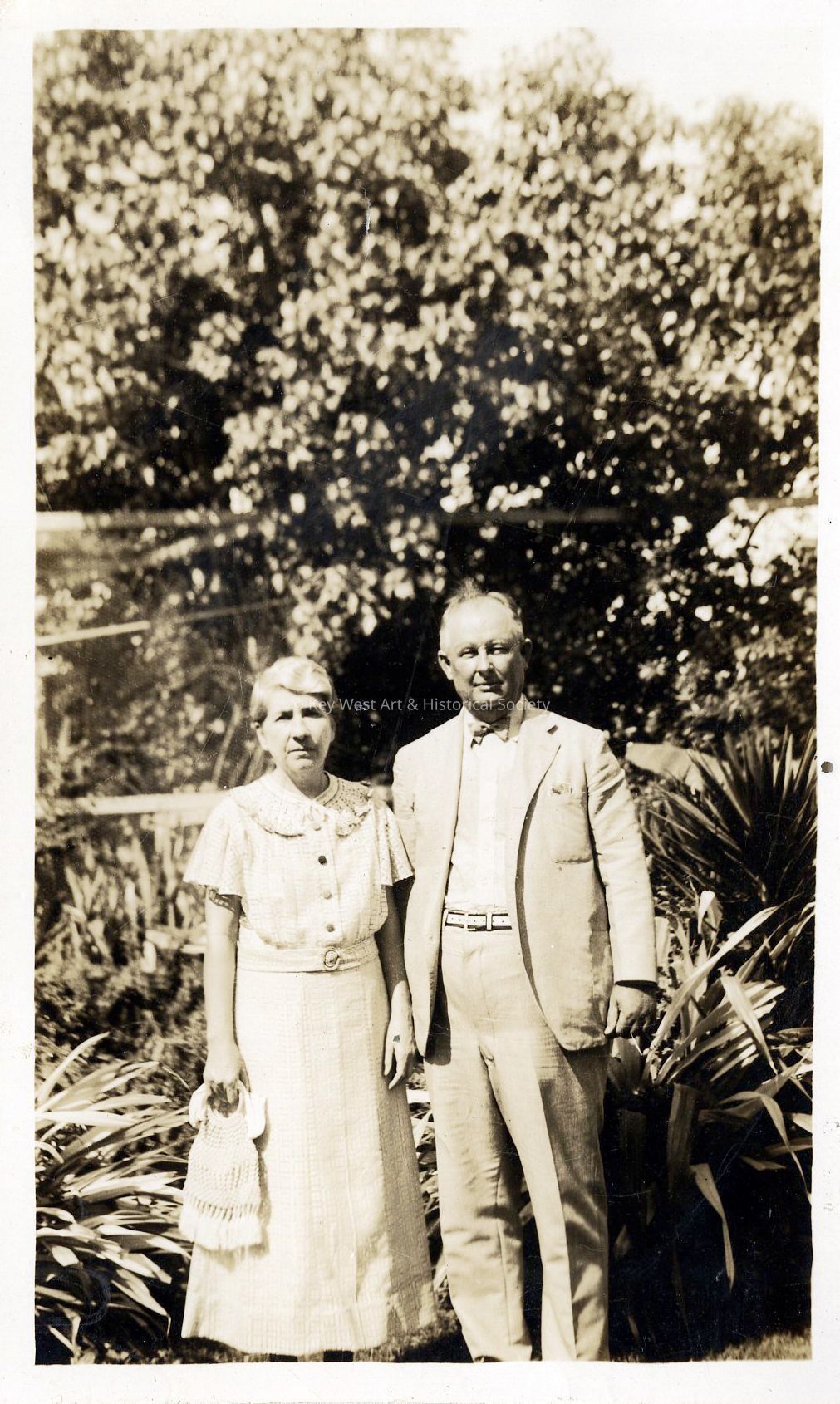 Black and white photograph of William Demerritt and his wife Claudia Albury Demerritt in the garden of the Key West Lighthouse.