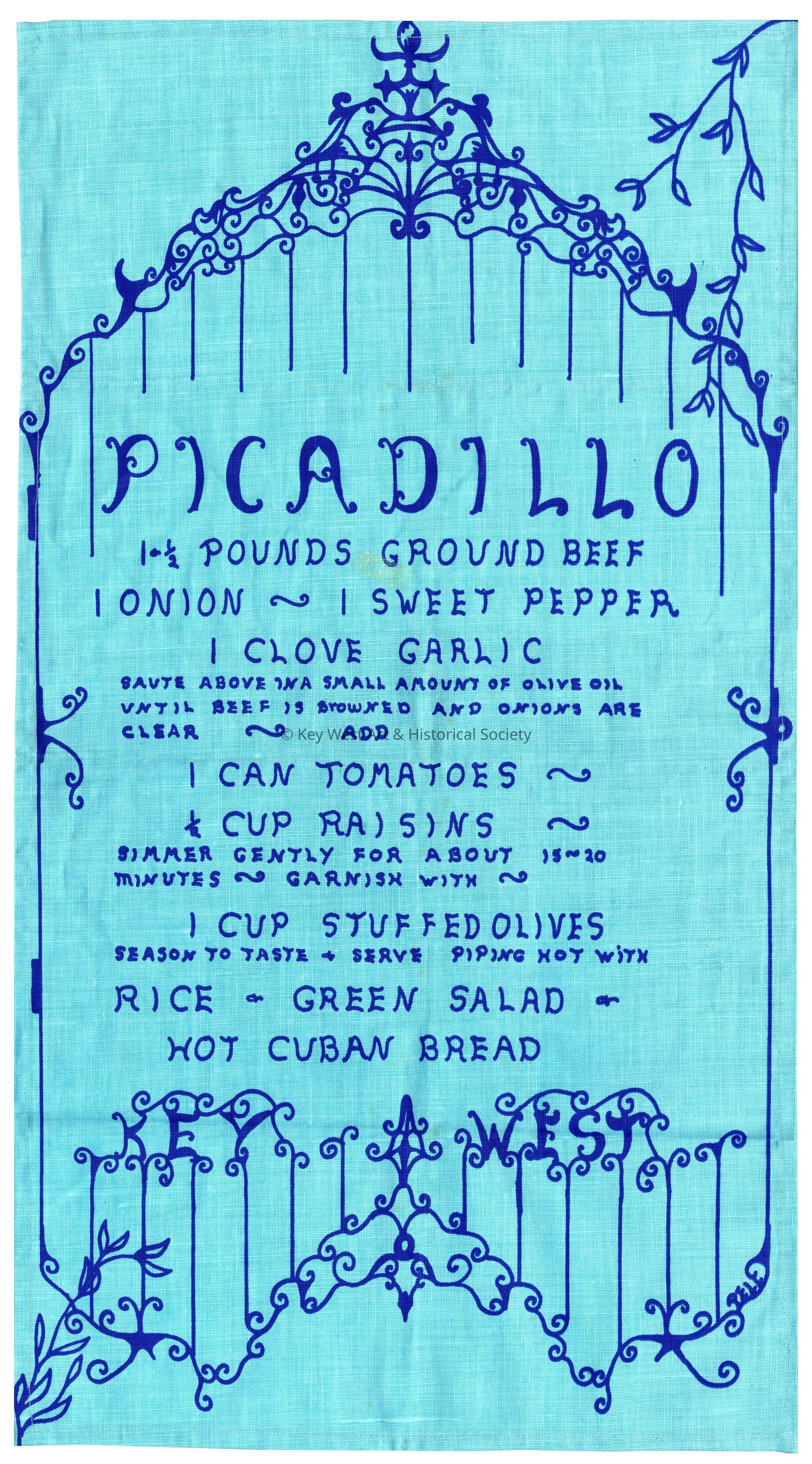 A cotton tea towel with text detailing a recipe for the popular Cuban dish picadillo. The towel was designed by Peter Pell for Key West Hand Print Fabrics.