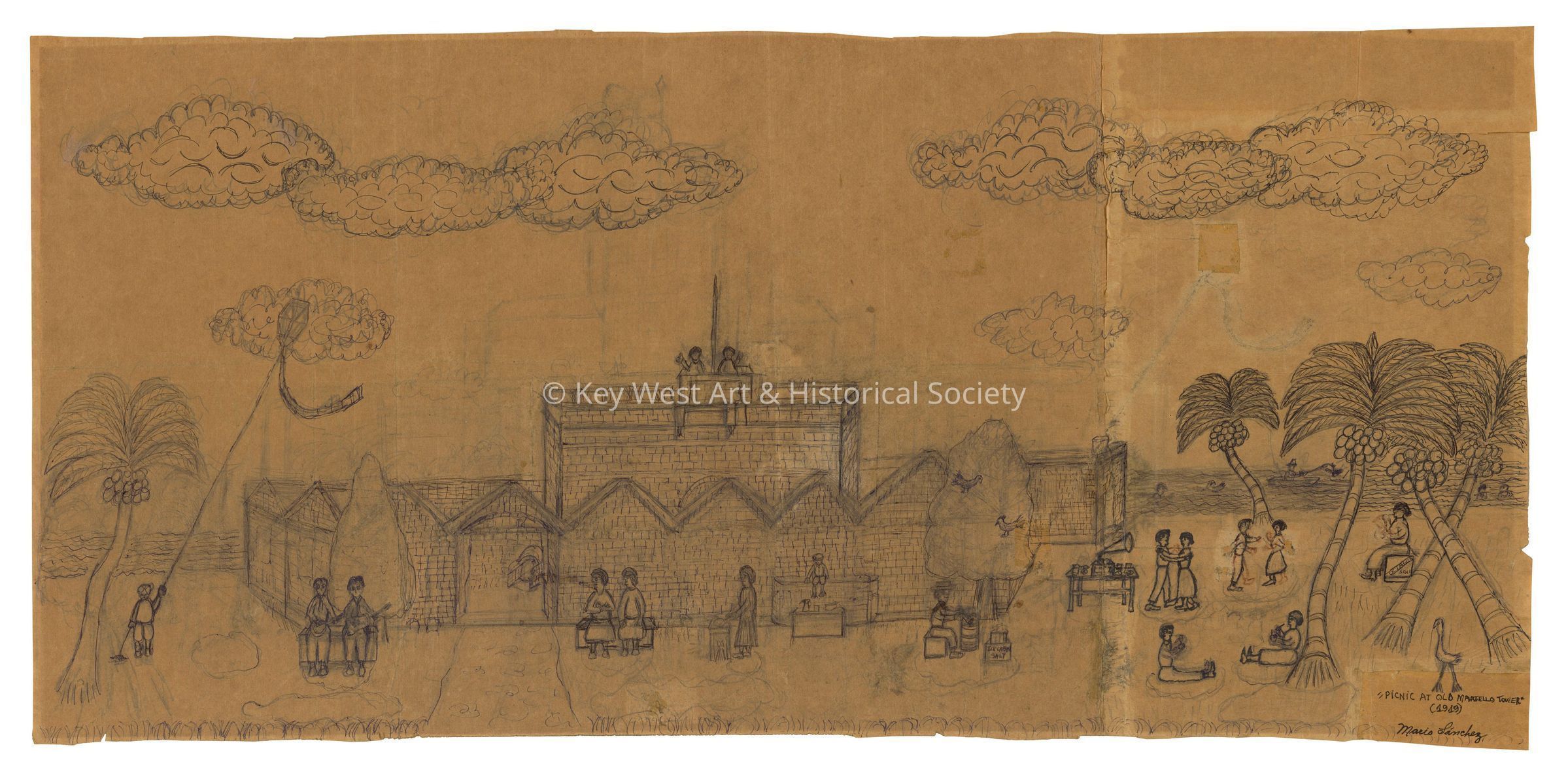 Pencil drawing on an unfolded paper bag by Mario Sanchez depicting a picnic at Fort East Martello. Many groups of people are outside the fort, some are flying a kite, reading, and dancing. Matches wood carving 1987.01.3229.Type of Drawing