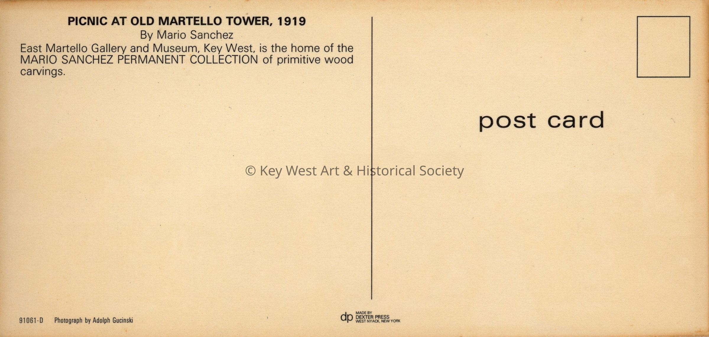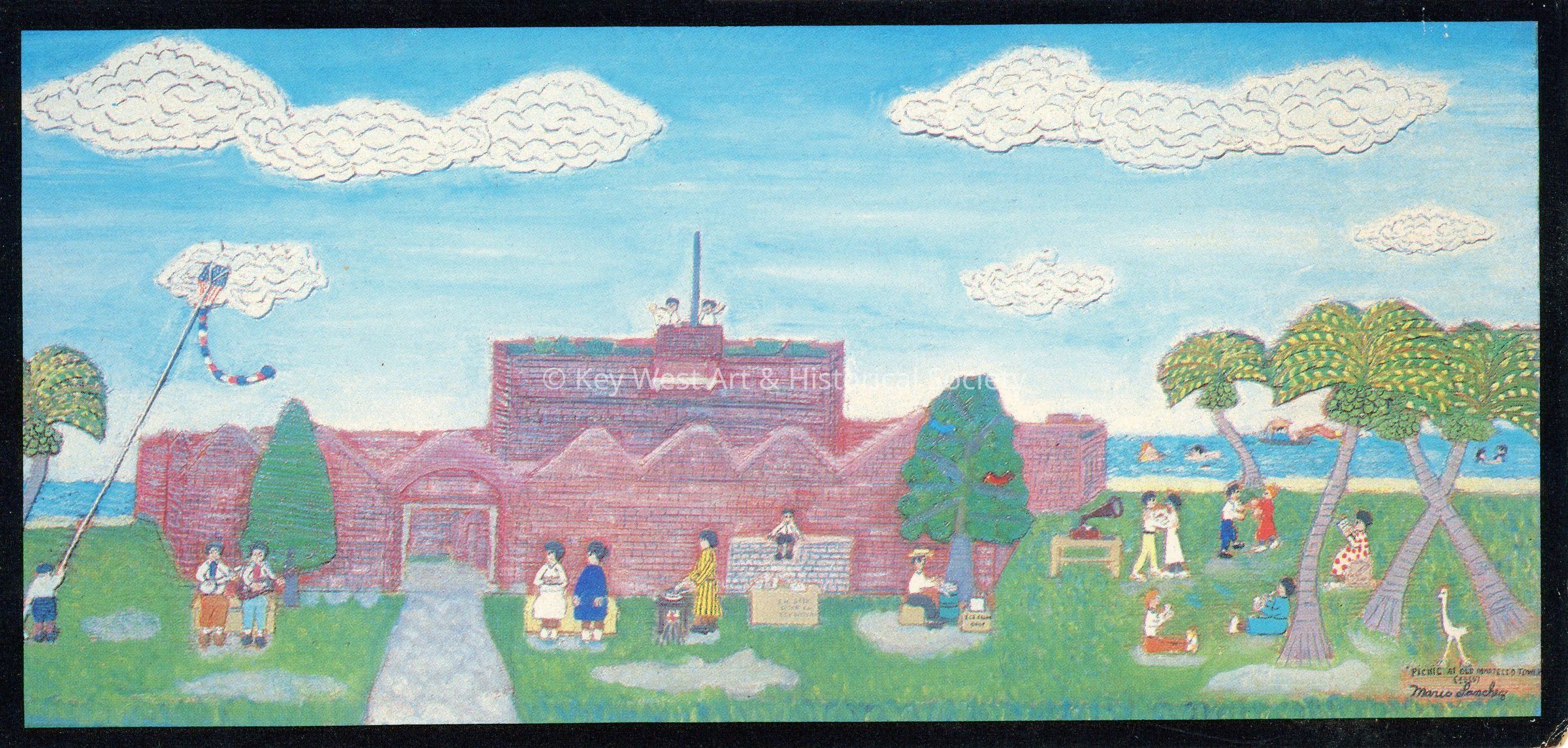 Postcard depicting a wood carving by Mario Sanchez. The postcard shows a picnic scene at Fort East Martello where people are outside the fort participating in various activities including flying a kite, dancing, reading and playing music. Notation on verso reads 'PICNIC AT OLD MARTELLO TOWER, 1919 By Mario Sanchez. East Martello Gallery and Museum, Key West, is home of the MARIO SANCHEZ PERMANENT COLLECTION of primitive wood carvings.'Subject Place