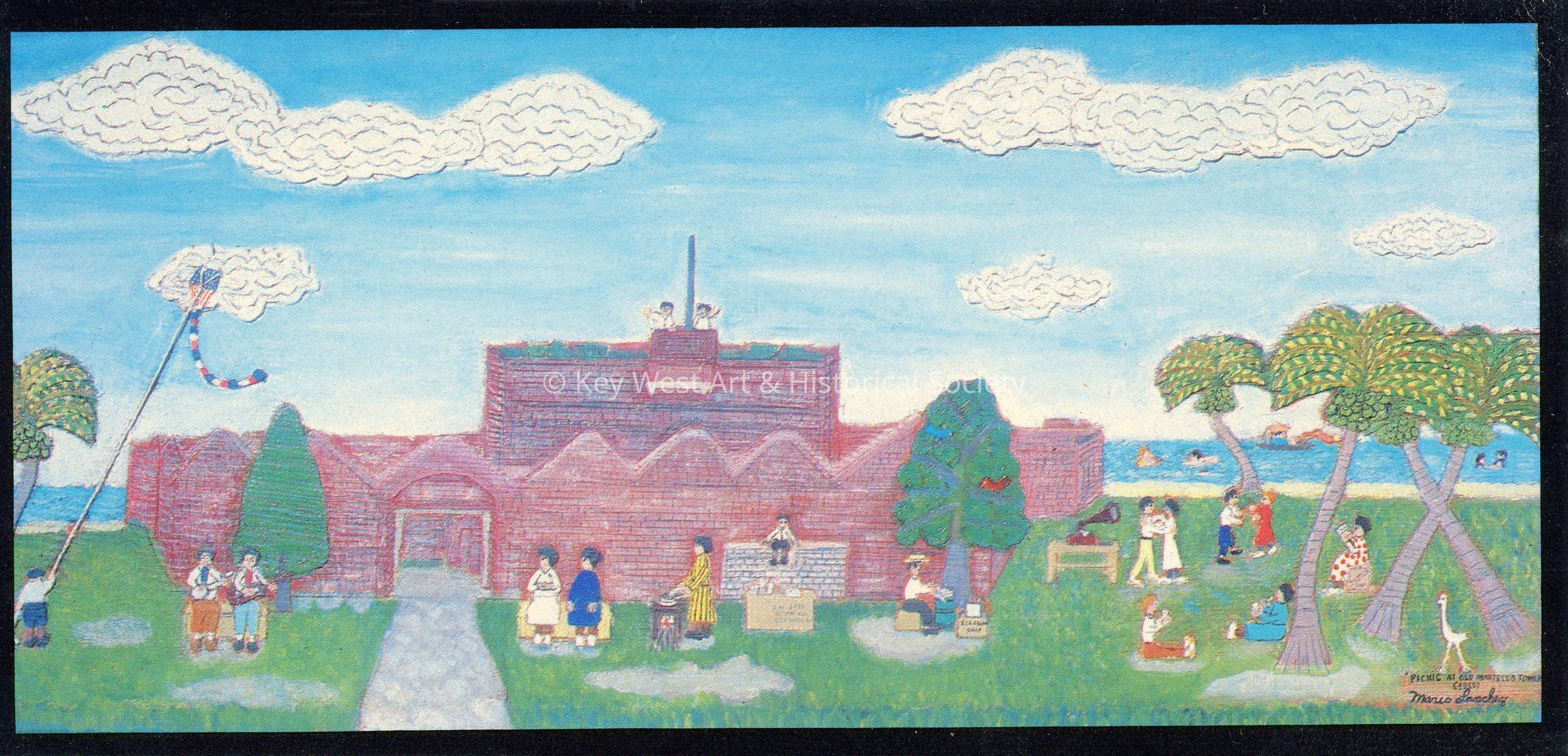 Postcard depicting a wood carving by Mario Sanchez. The postcard shows a picnic scene at Fort East Martello where people are outside the fort participating in various activities including flying a kite, dancing, reading and playing music. Notation on verso reads 'PICNIC AT OLD MARTELLO TOWER, 1919 By Mario Sanchez. East Martello Gallery and Museum, Key West, is home of the MARIO SANCHEZ PERMANENT COLLECTION of primitive wood carvings.'Subject Place