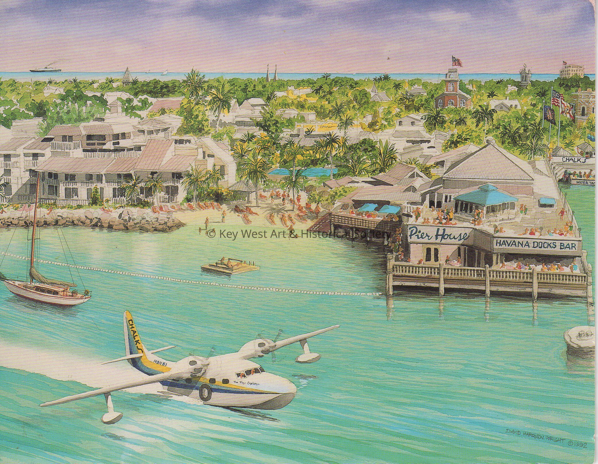 Postcard depicting boats and a sea plane near the Pier House. Signs on the buildings read, 'Pier House; Havana Docks Bar; Chalks'. The description on the verso reads, 'However you get here...you know you have arrived when your Key West address is Number One Duval....Pier House Resort and Caribbean Spa, "The Original Key West". One Duval Street, Key West, Florida, 33040; (305) 296-4600 - (800) 327-8340'.Subject Place