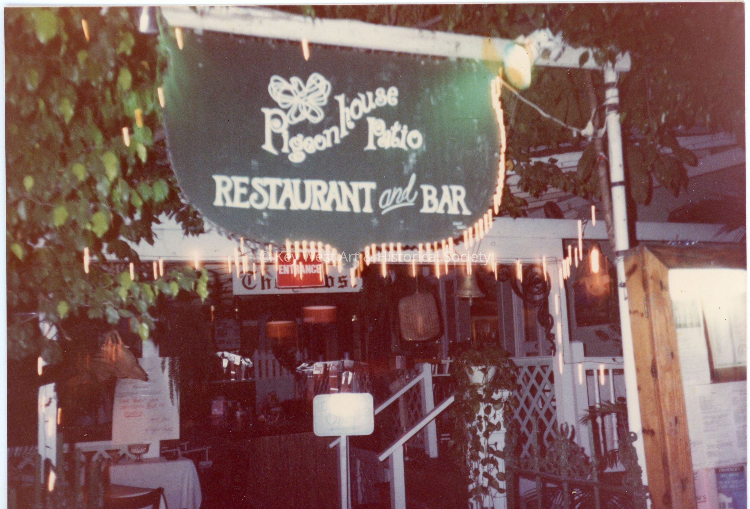 Large hanging sign for Pigeon House Patio Restaurant and Bar formerly located at 301 Whitehead Street.