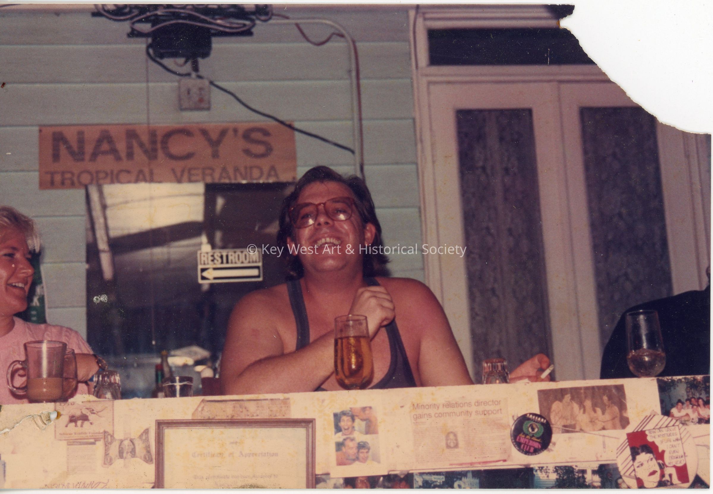 Two patrons at Pigeon House Patio Restaurant and Bar formerly located at 301 Whitehead Street. There is a sign in the background that reads 'Nancy's Tropical Veranda'.