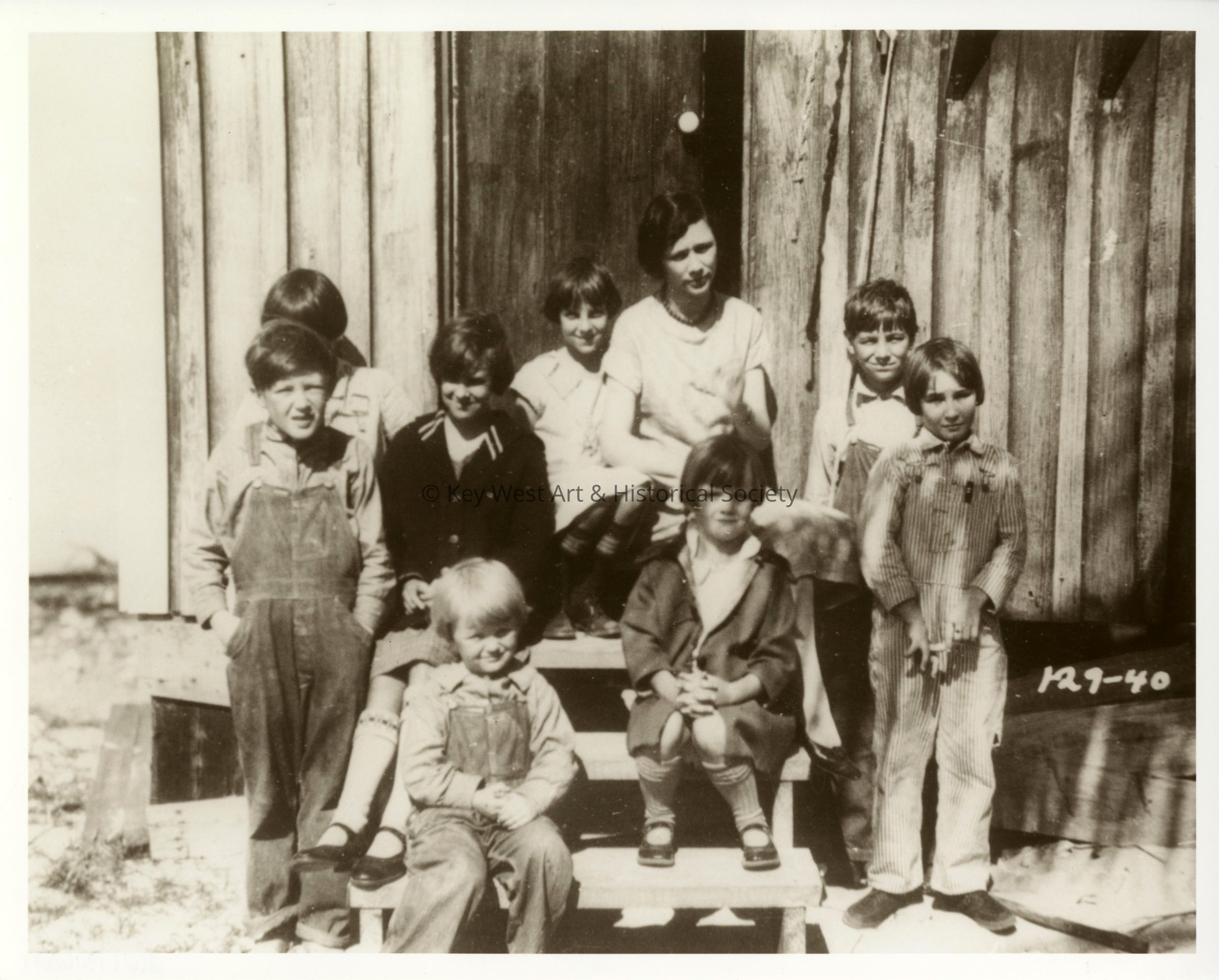 Black and white photograph of school children and their teacher at Pigeon Key.