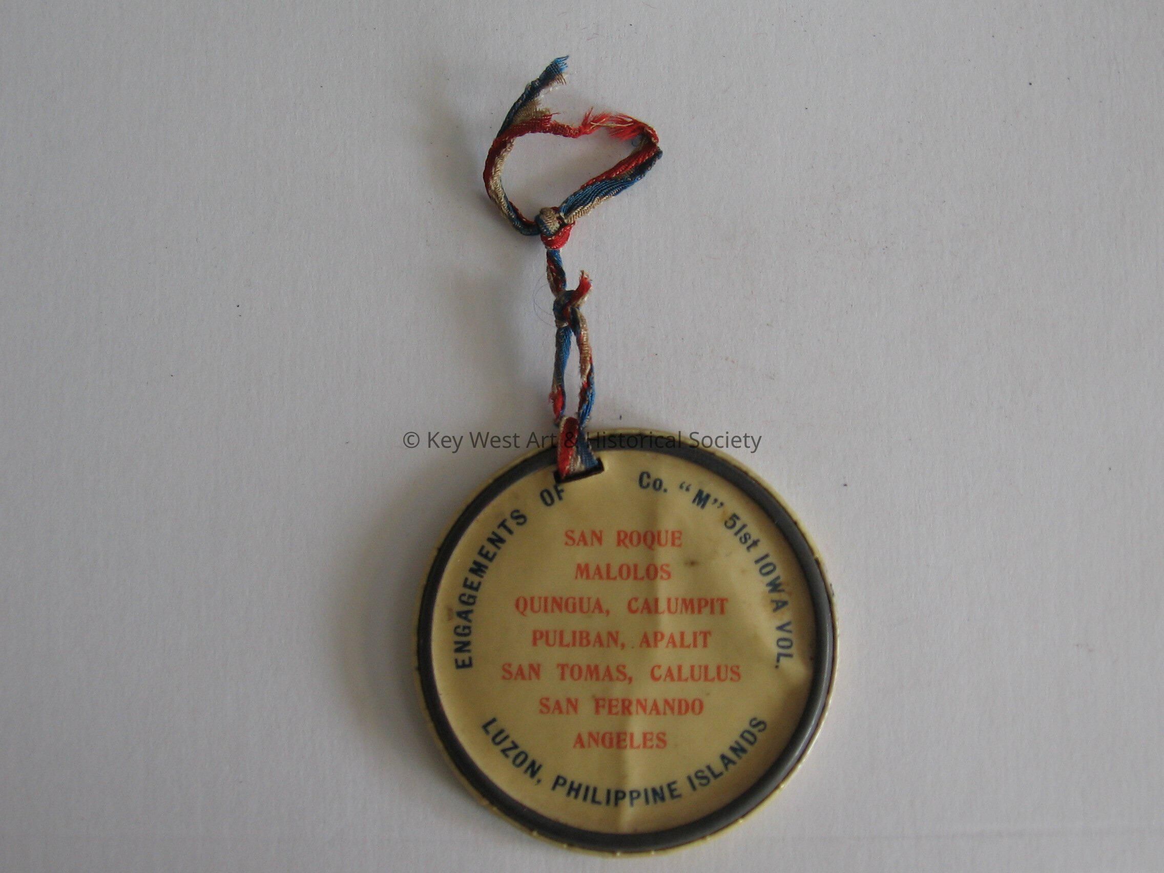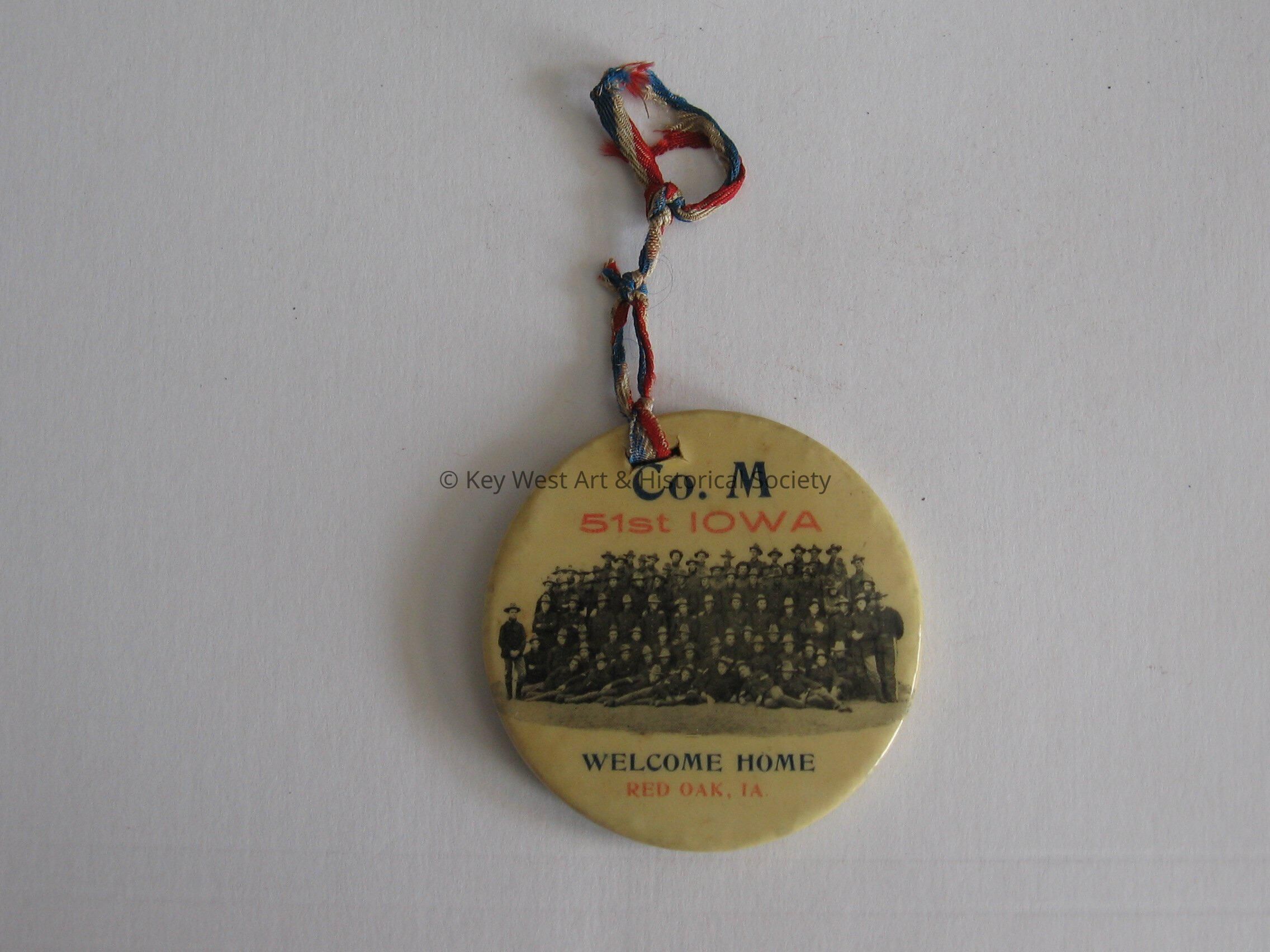 Plastic pin that reads "Co. M 51st Iowa" "Welcome home Red Oak, IA". There is a picture of the company on the front. The back reads "Engagements of Co. "M" Iowa Vol."Collection