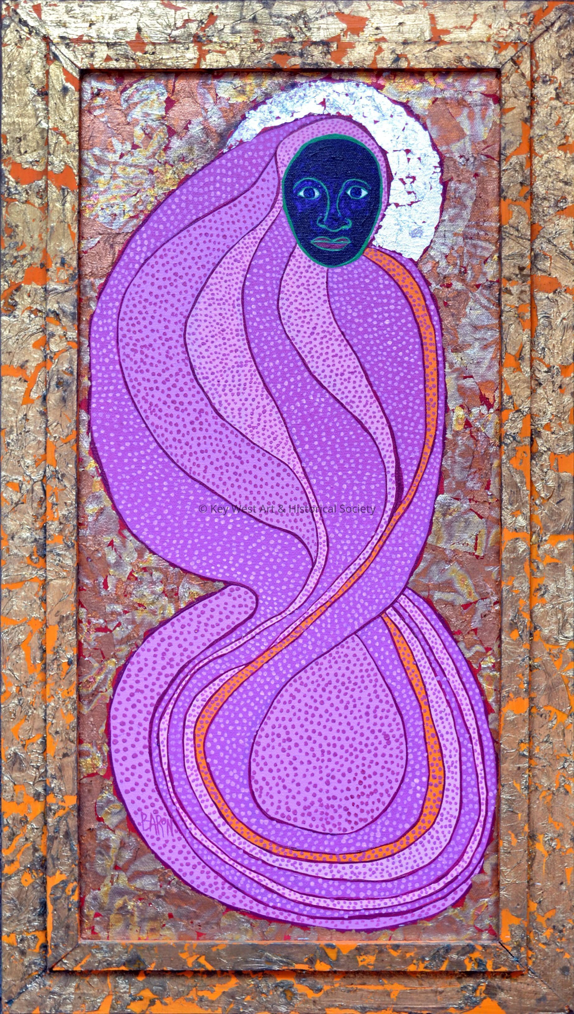 Acrylic, gold leaf and silver leaf painting by Jack Baron depicting a black Madonna wearing a pink robe.Type of Painting