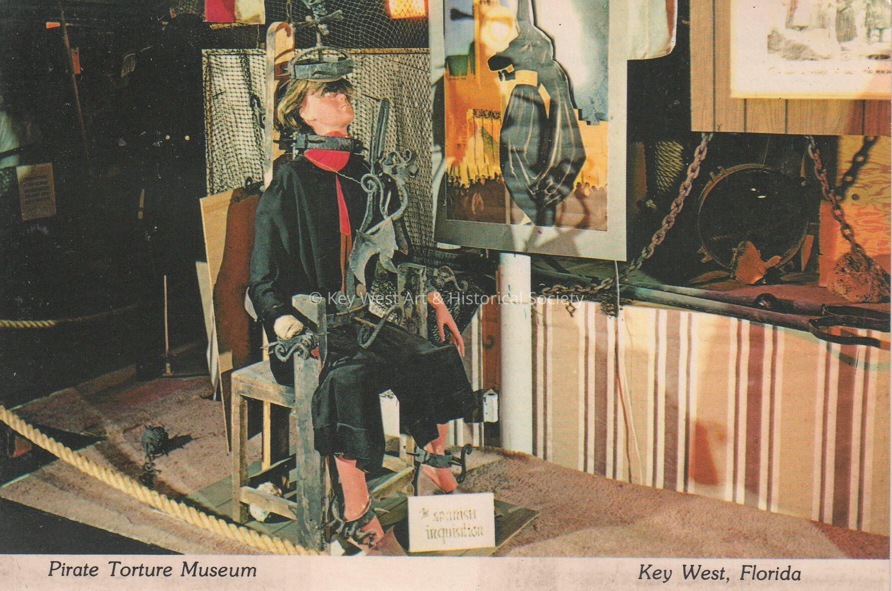 Postcard depicting a seated mannequin in shackles near a sign that reads, 'Spanish Inquisition'. The caption reads, ‘Pirate Torture Museum, Key West, Florida'. The description on the verso reads, 'Pirate Torture Museum, Simonton and Eaton Streets. This pirate torture museum shows various instruments of torture used by pirates and the Spanish Inquistion. A narrative of the various desplays accompanies the tour. An eye piercing torture machine is shown.'Subject Place