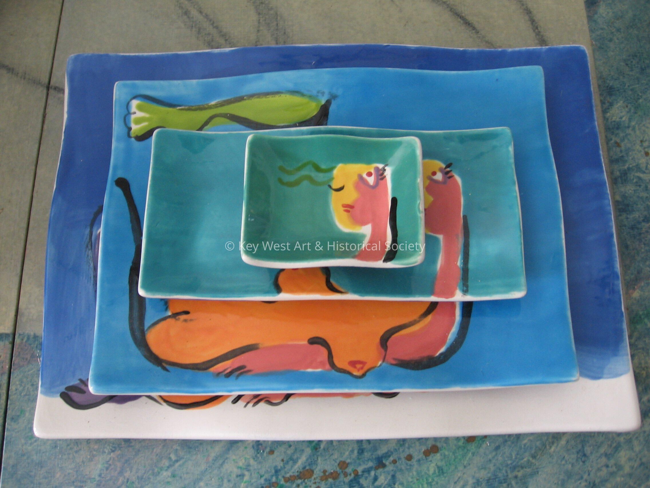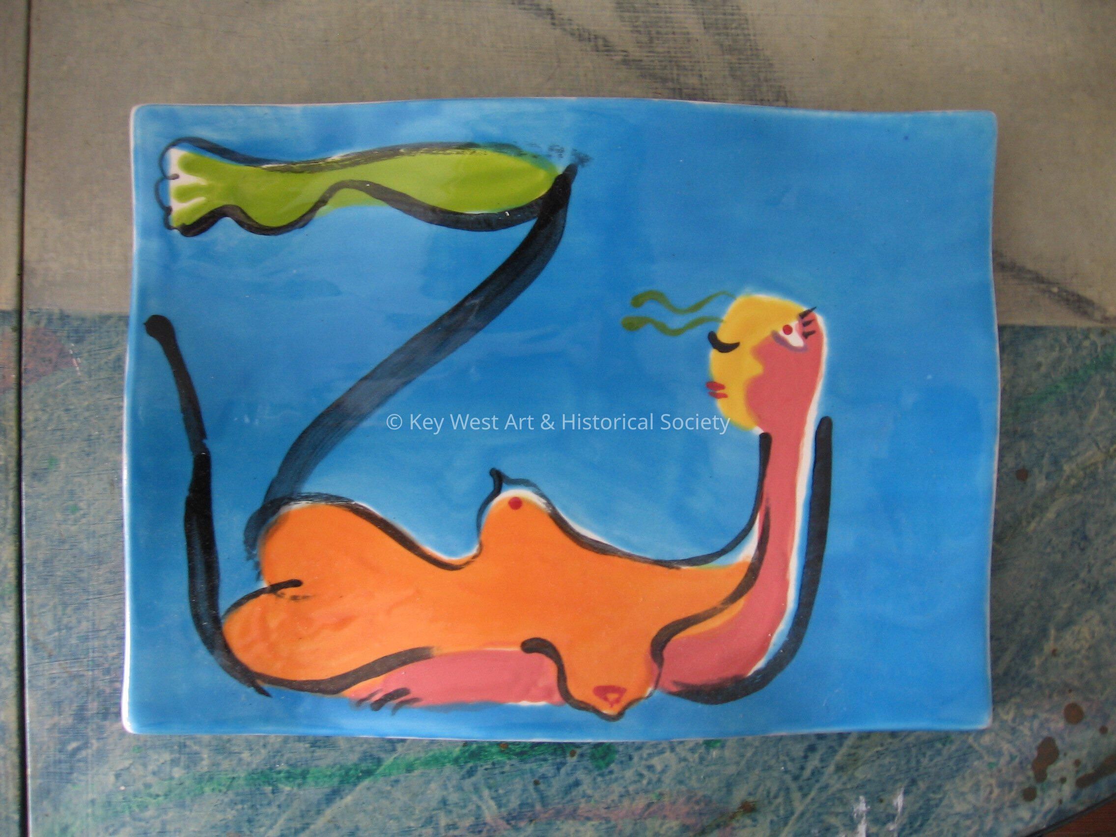 Painted ceramic plate. 3 of 4. Bottom of plate is painted blue. Inside of plate is painted light blue with a figure painted on the plate.