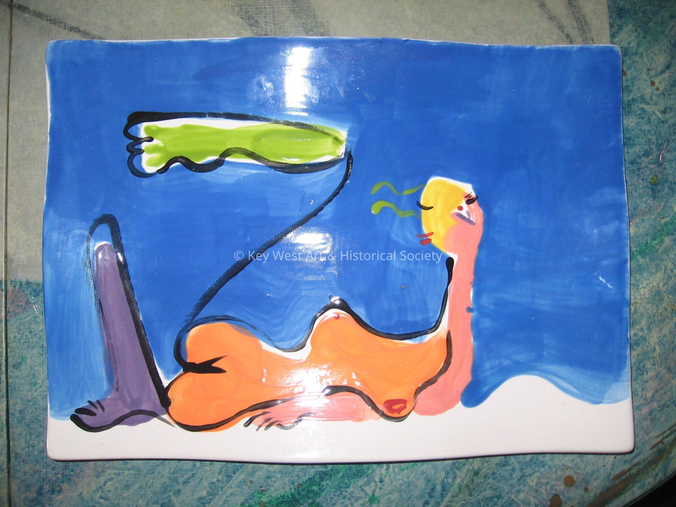 Painted ceramic plate. 4 of 4. Blue on the bottom. Painted figure on top of the plate.