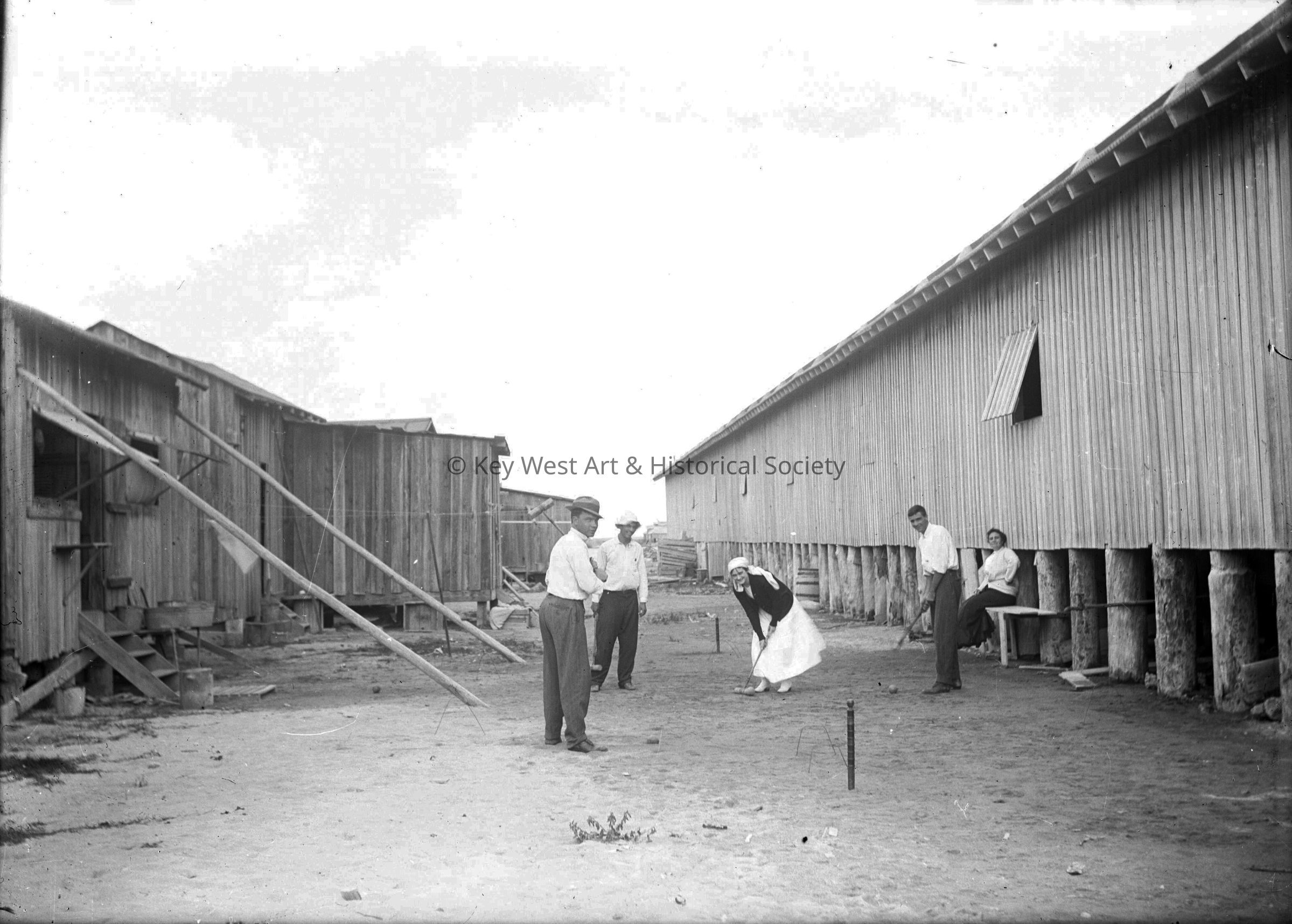 Black and white dry plate glass negative of men and women playing croquet on the north side of the cement warehouse at the Pigeon Key railroad camp. The woman leaning against the building is C.S. Coe's wife, Lulu. Her daughter Miriam is addressing the ball, and Coe's personal assistant N.B. Nickerson is between them. The image was taken during the construction of Seven Mile Bridge on the Overseas Railway.