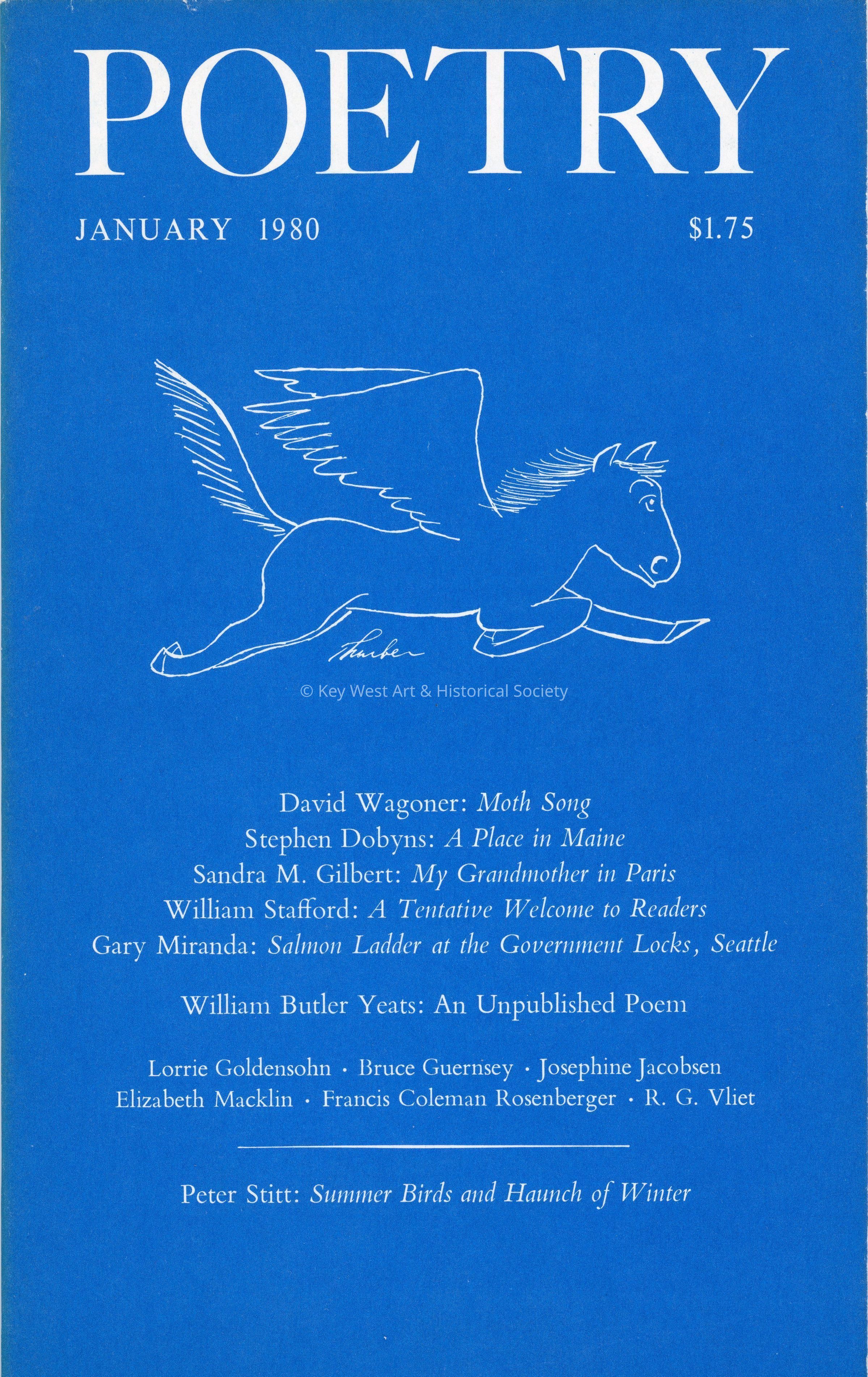 January 1980 issue of the monthly publication containing a compilation of contemporary poetry. This volume includes the essay 'Memorial Service for Elizabeth Bishop' by Penelope Laurans concerning the memorial ceremony held for Elizabeth Bishop at Radcliffe Yard.