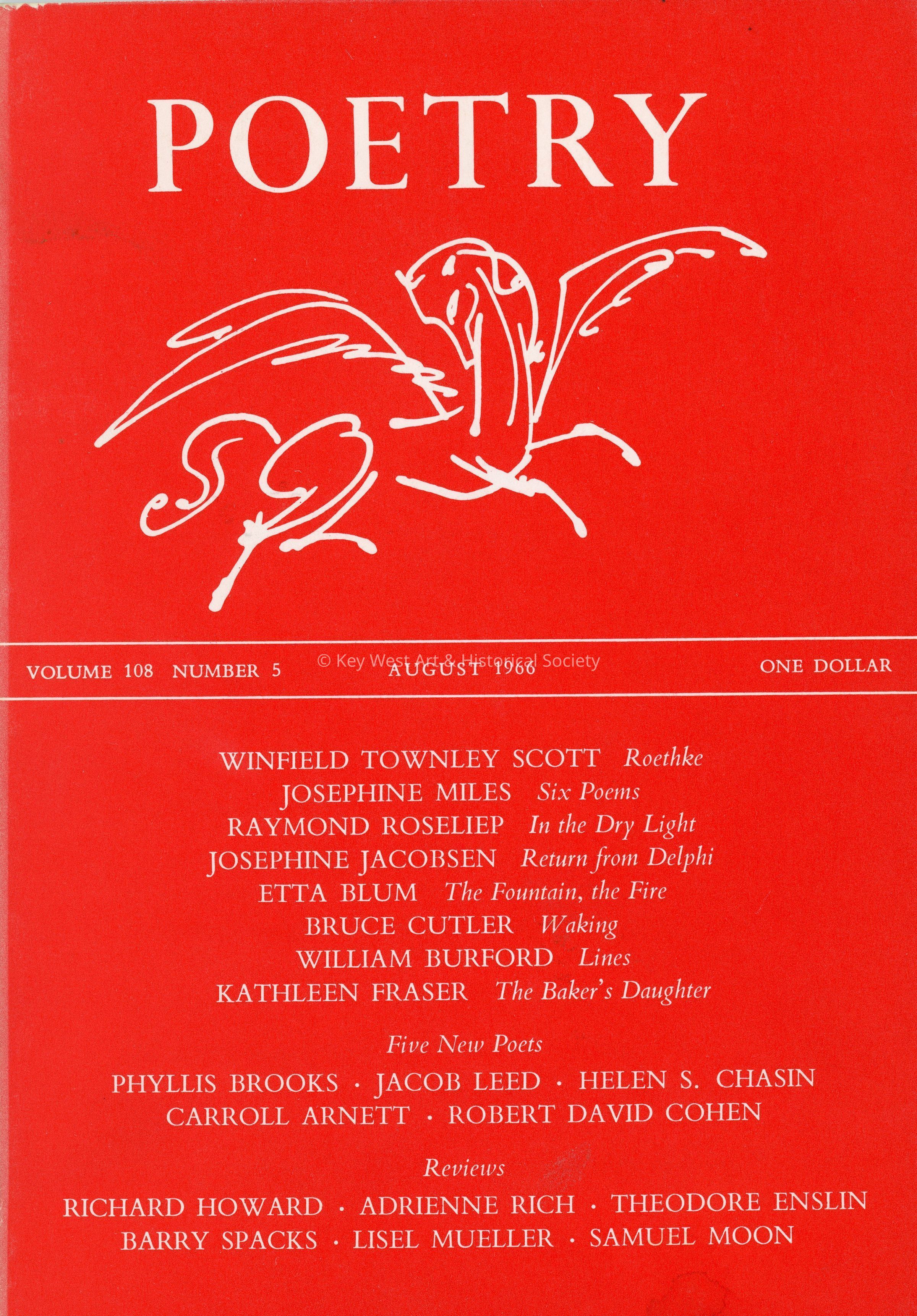 August 1966 issue of the monthly publication containing a compilation of contemporary poetry. This volume includes the essay 'The Sun the Other Way Around' by Lisel Mueller which reviews Elizabeth Bishop's publication 'Questions of Travel.'