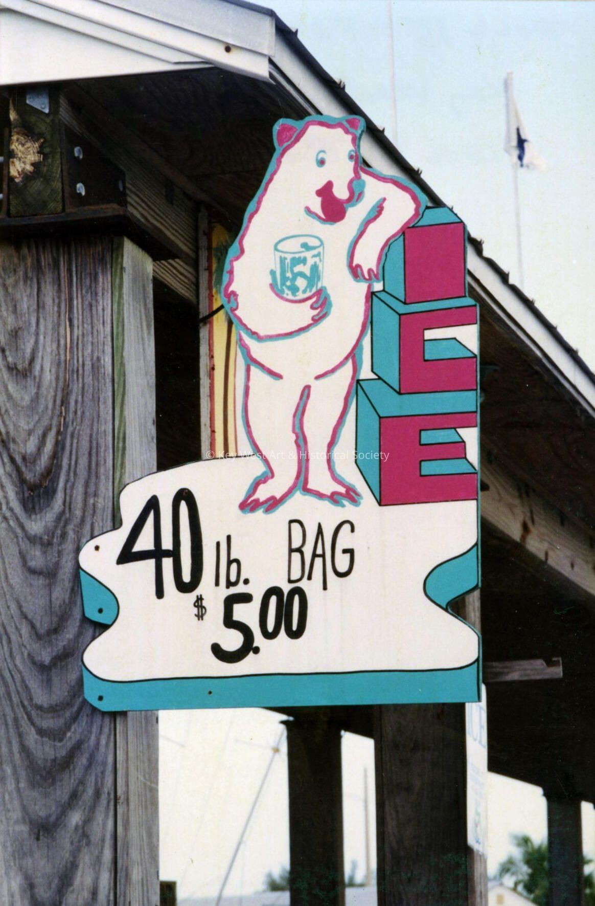Color photograph taken by historian James M. Goode of the polar bear Ice sign at Garrison Bight Marina during a trip to Key West in August 2001. Printed from Roll 15.