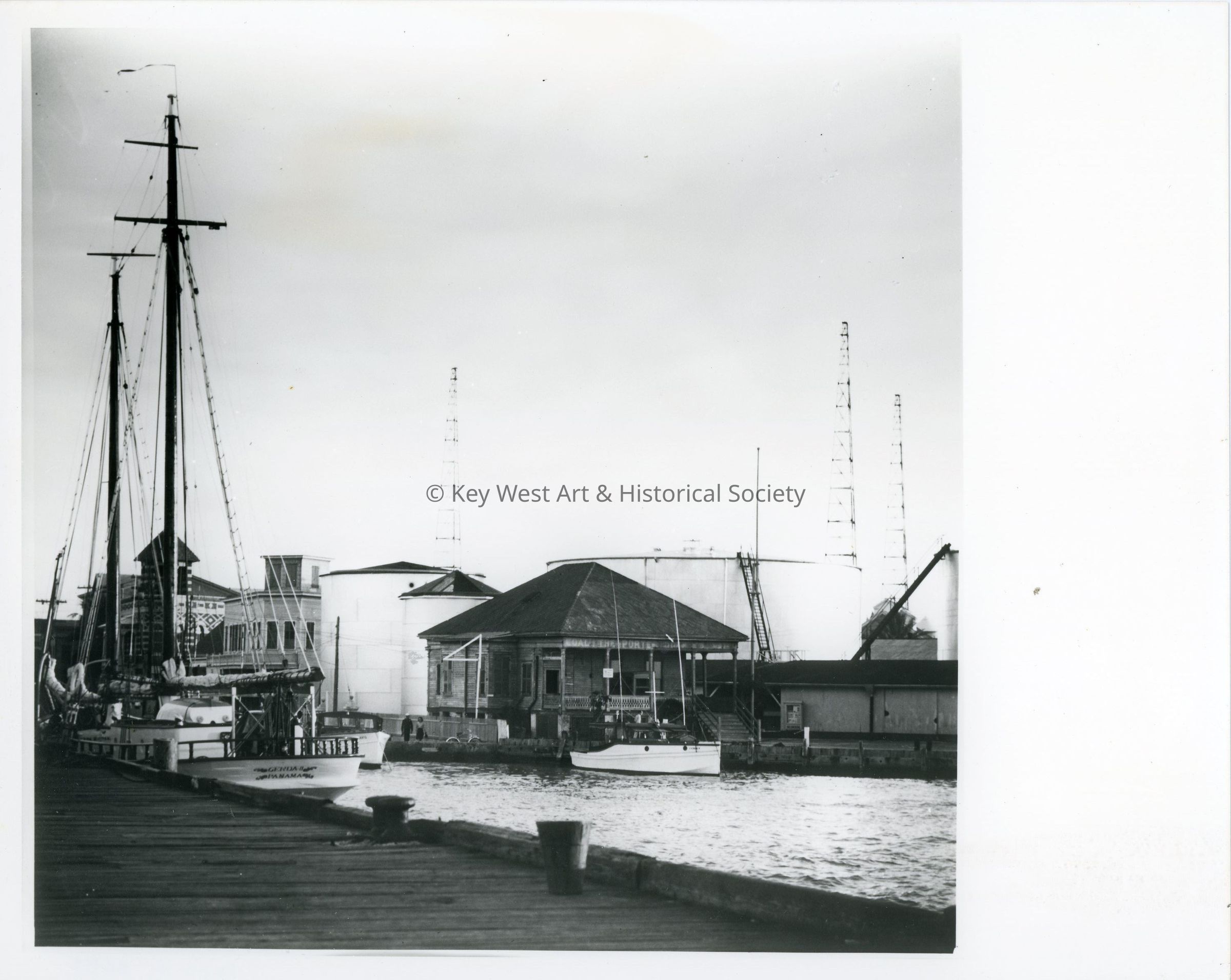Black and white photograph of the Porter Dock located at the north end of Duval Street looking toward the Porter Dock Company building.