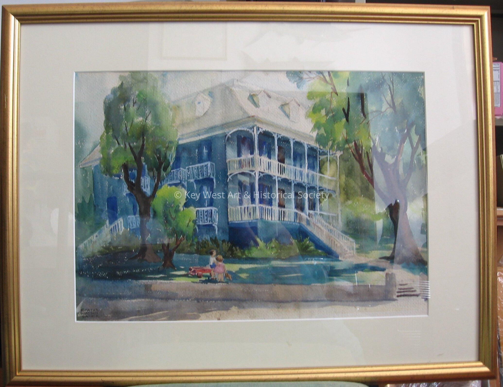 Watercolor by Martha Watson Sauer depicting the three story house with wrap around porches formerly belonging to Dr. Joseph Yates Porter. The house sits on the corner of Duval and Caroline streets. Outside the house, two children are playing with a wagon.Artwork Details