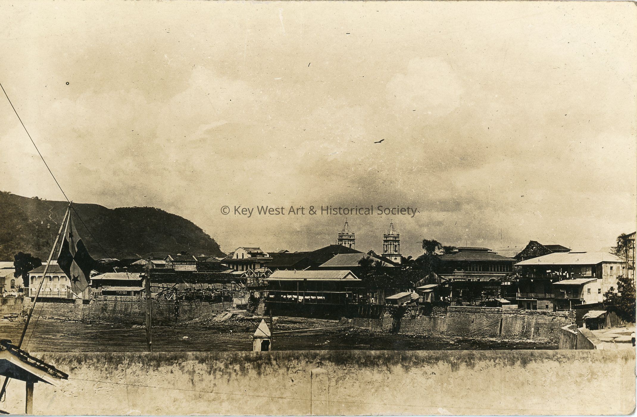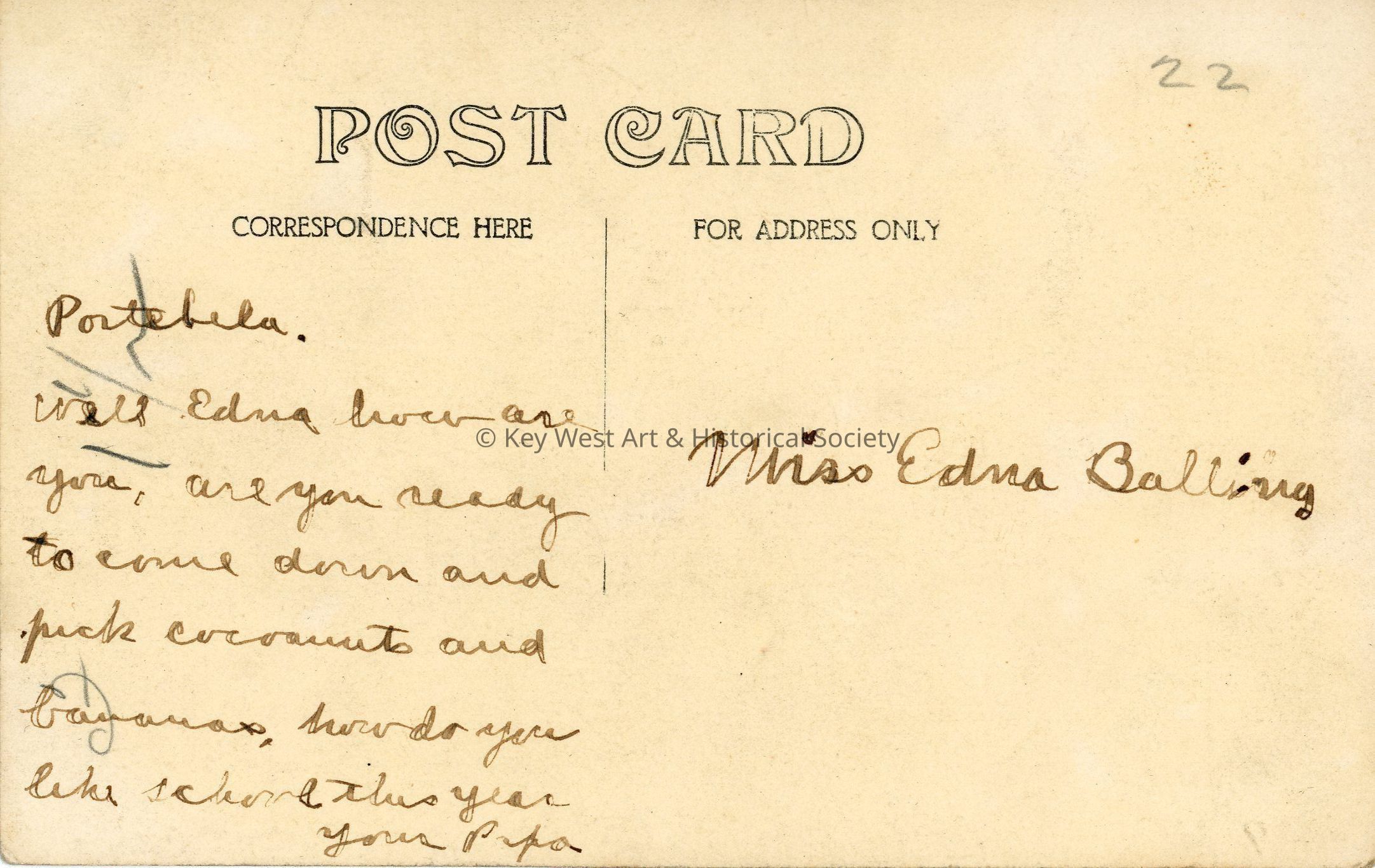 Black and white photograph postcard depicting the town of Portobelo. The Panama flag can be seen to the left. The postcard is addressed to Miss Edna Balling. Verso has a handwritten note.