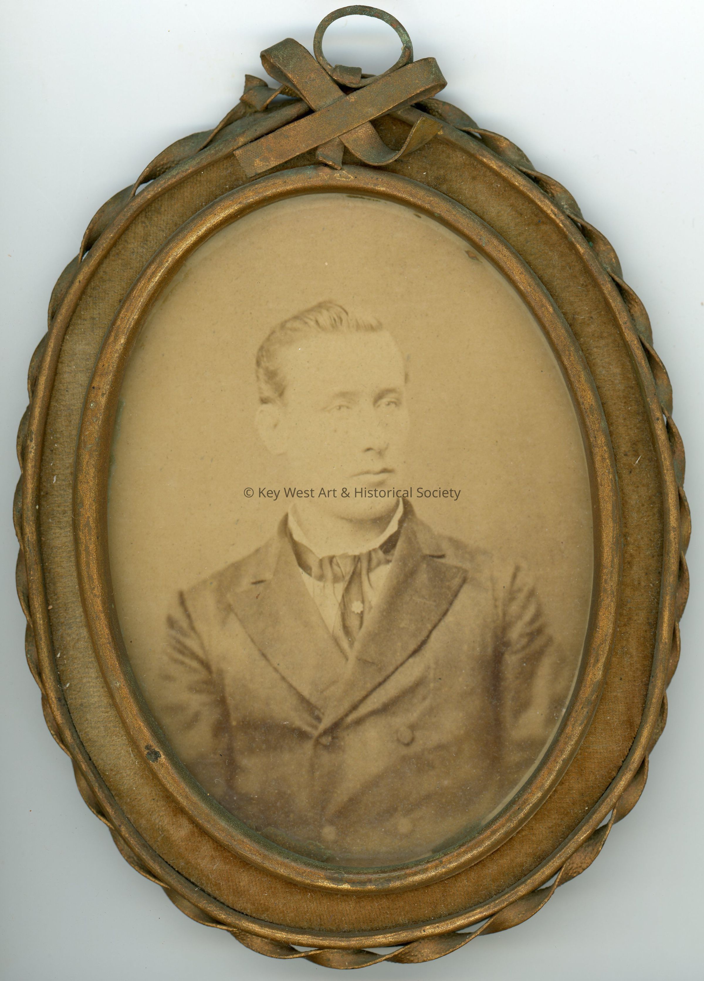 Sepia photograph portrait of an unknown man wearing a double breasted jacket. The photograph is contained within an oval shaped metal frame that has been painted gold. The frame has a black faux-leather backing and a pane of glass covering the photograph.