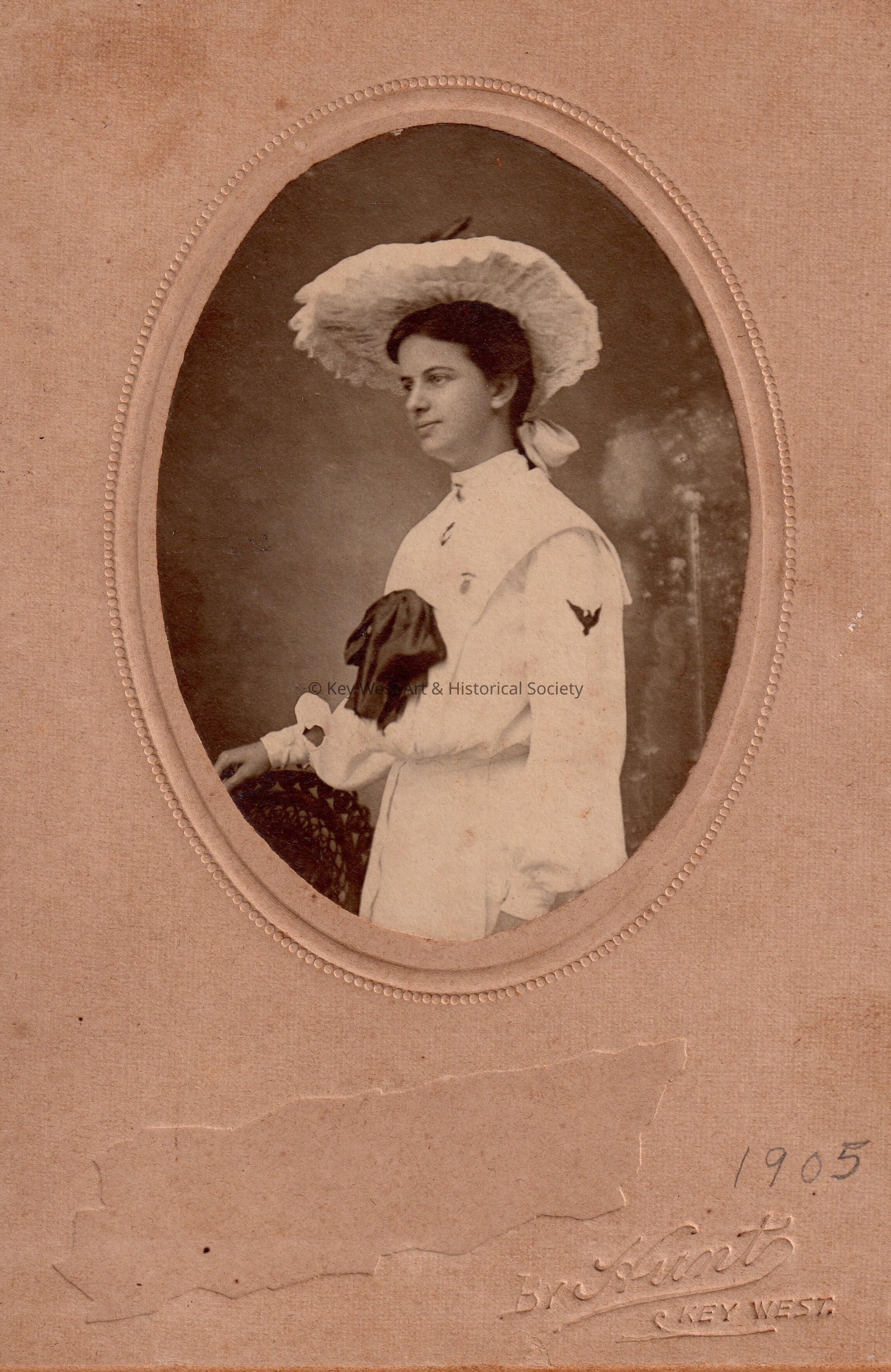 Cabinet card portrait of an unknown woman wearing a hat, taken by Hunt Photographers in Key West.