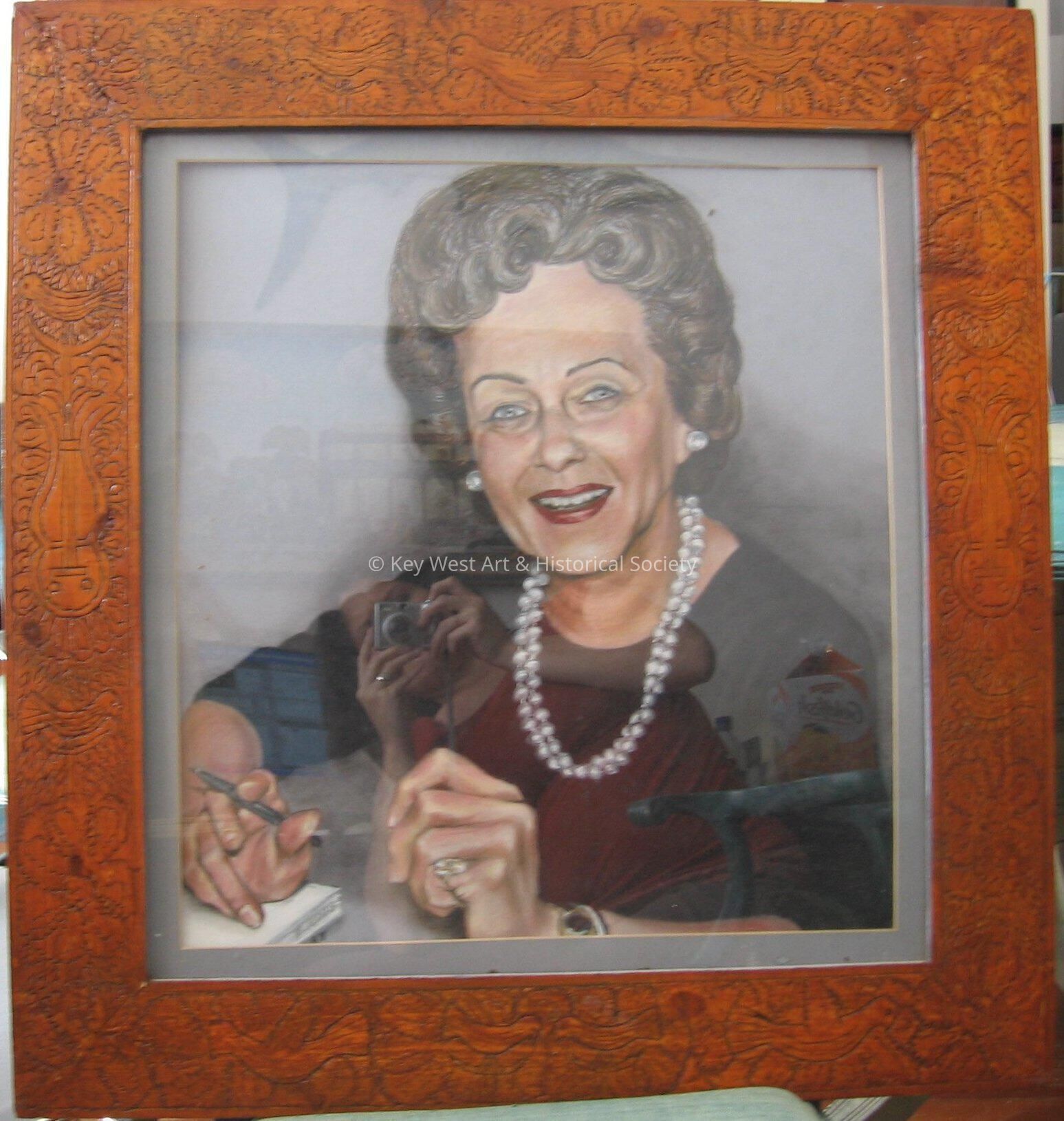 Pastel portrait of Key West notable resident and Mario Sanchez supporter Margo Golan by Tom Rolg. Subject is seated and holds a pen in her right hand. Golan also wears a pearl necklace and earrings. The portrait is housed in an intricate frame by Mario Sanchez.Type of Drawing