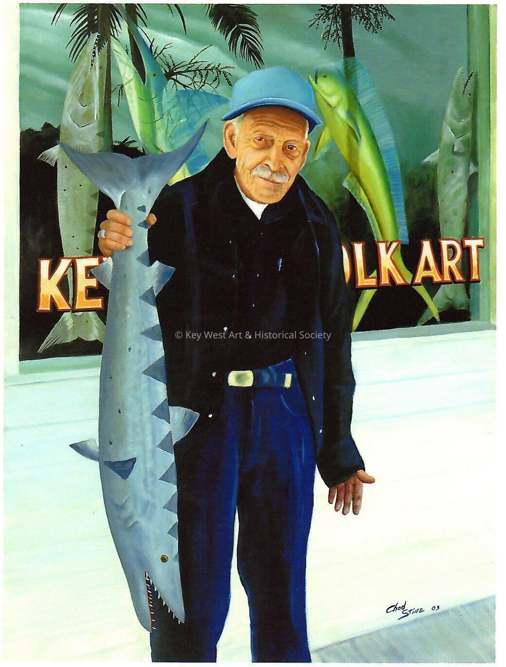Print portrait of Tony Barcelo holding a fish while standing in front of a store; possibly Key West Folk Art. Accession # 2008.17.0002.Collection