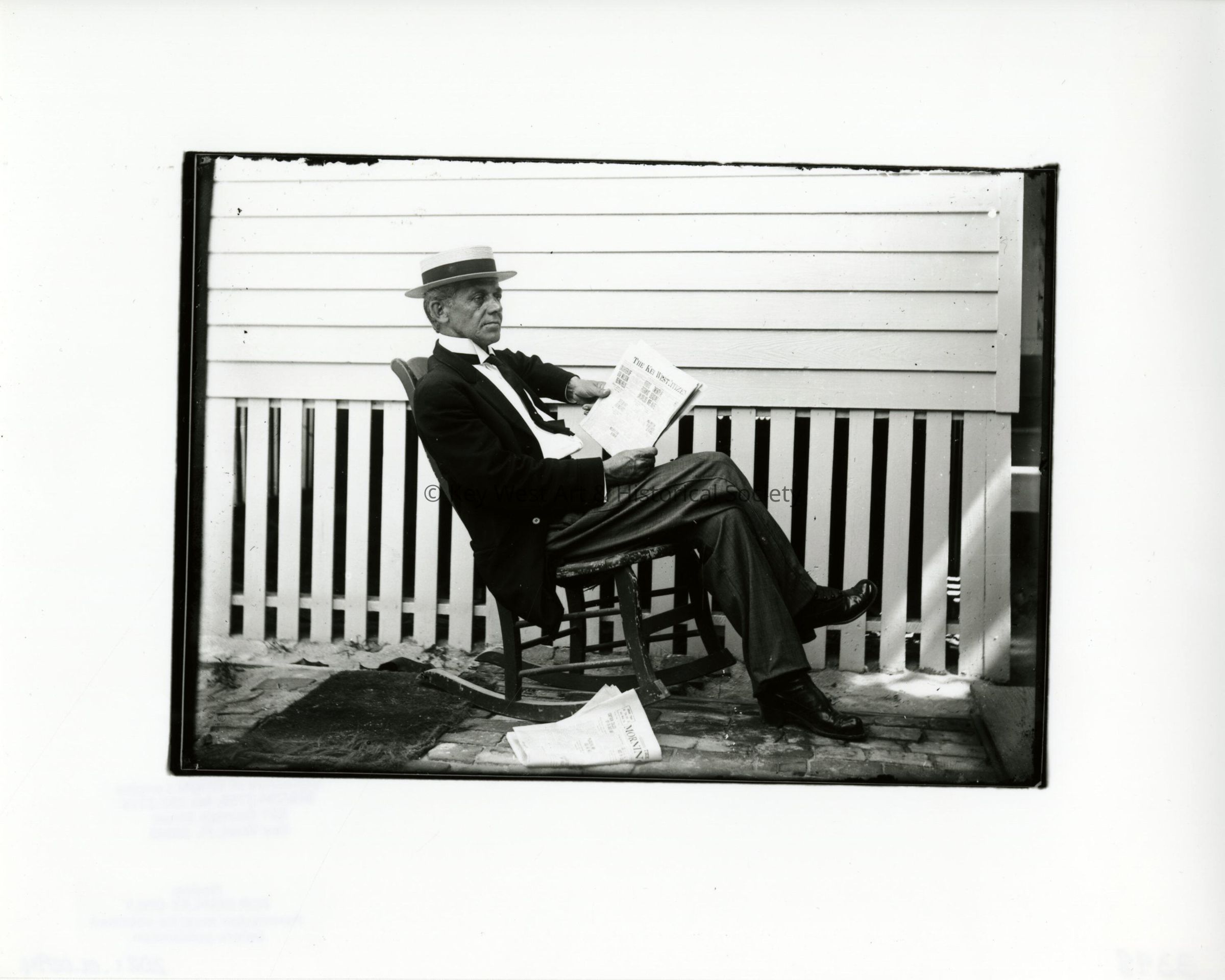Black and white print taken from a dry plate glass negative of an unknown man posing alongside Key West house reading the Key West Citizen.