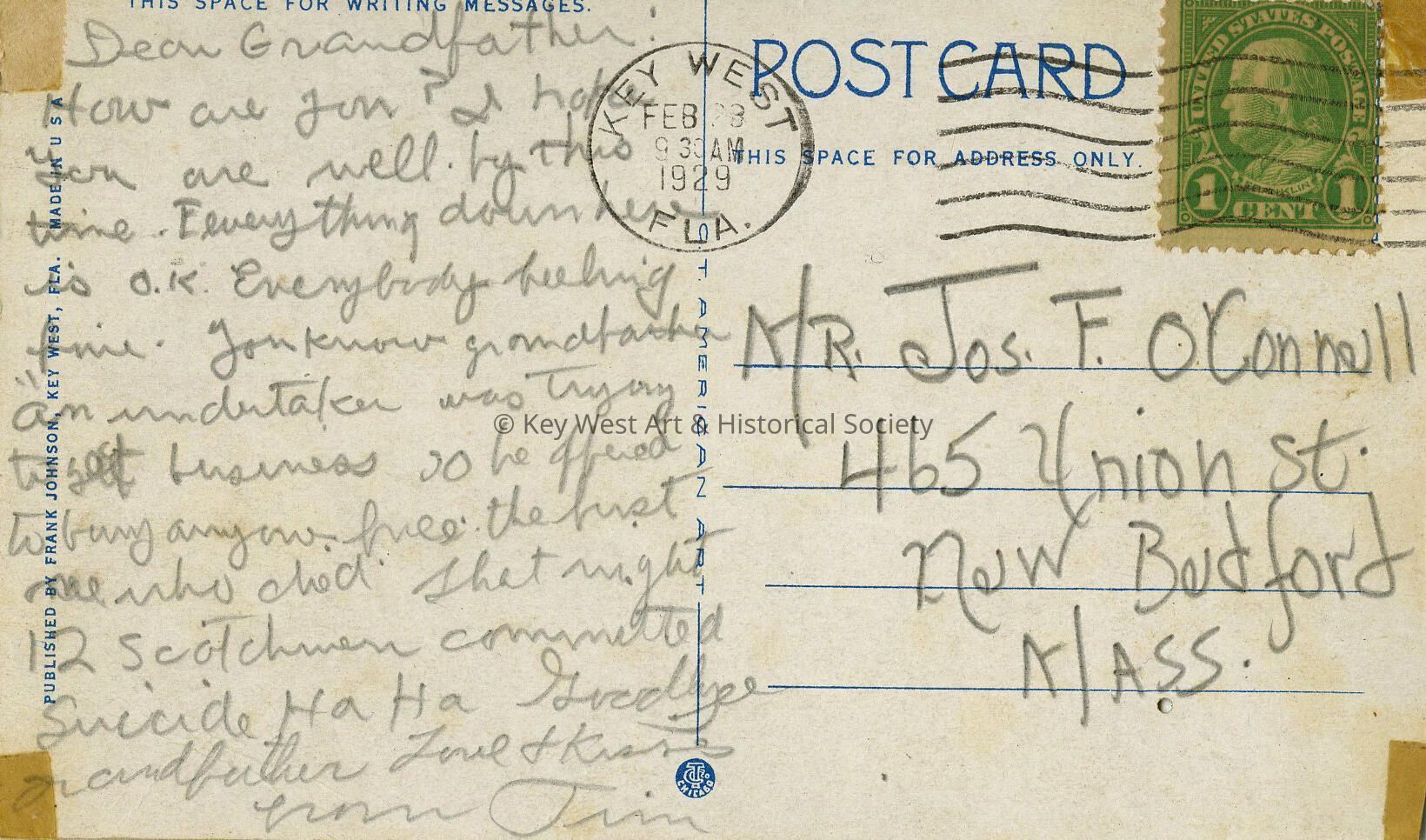 Postcard depicting the Key West Custom House. The caption reads, ‘Post Office and Custom House, Key West, Fla.' The postcard was sent by James Buckley to his grandfather from Key West. Buckley worked at Casa Marina during the winter of 1928-1929.Subject Place