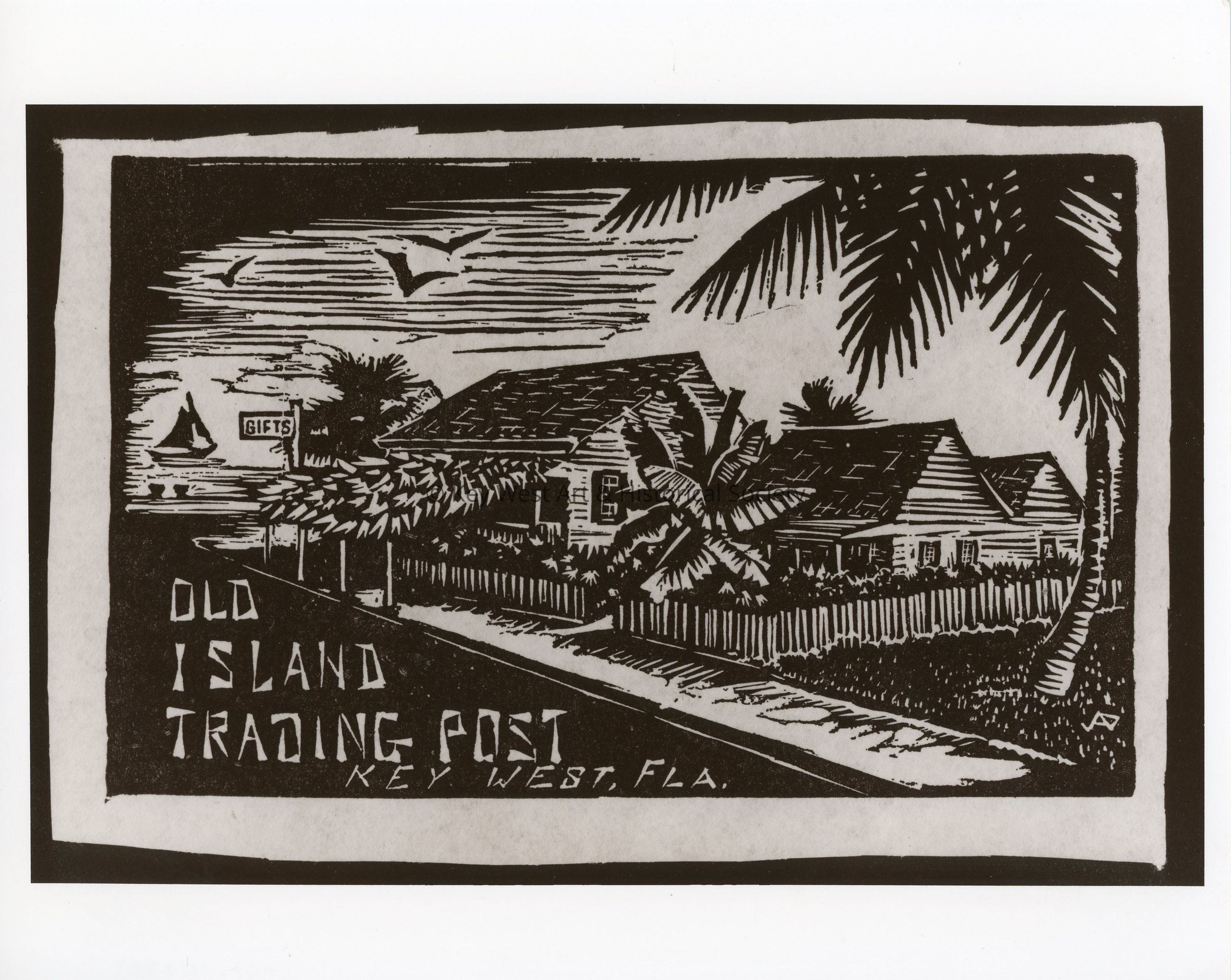 Black and white postcard of The Old Island Trading Post located at the corner of Caroline and Whitehead Streets.