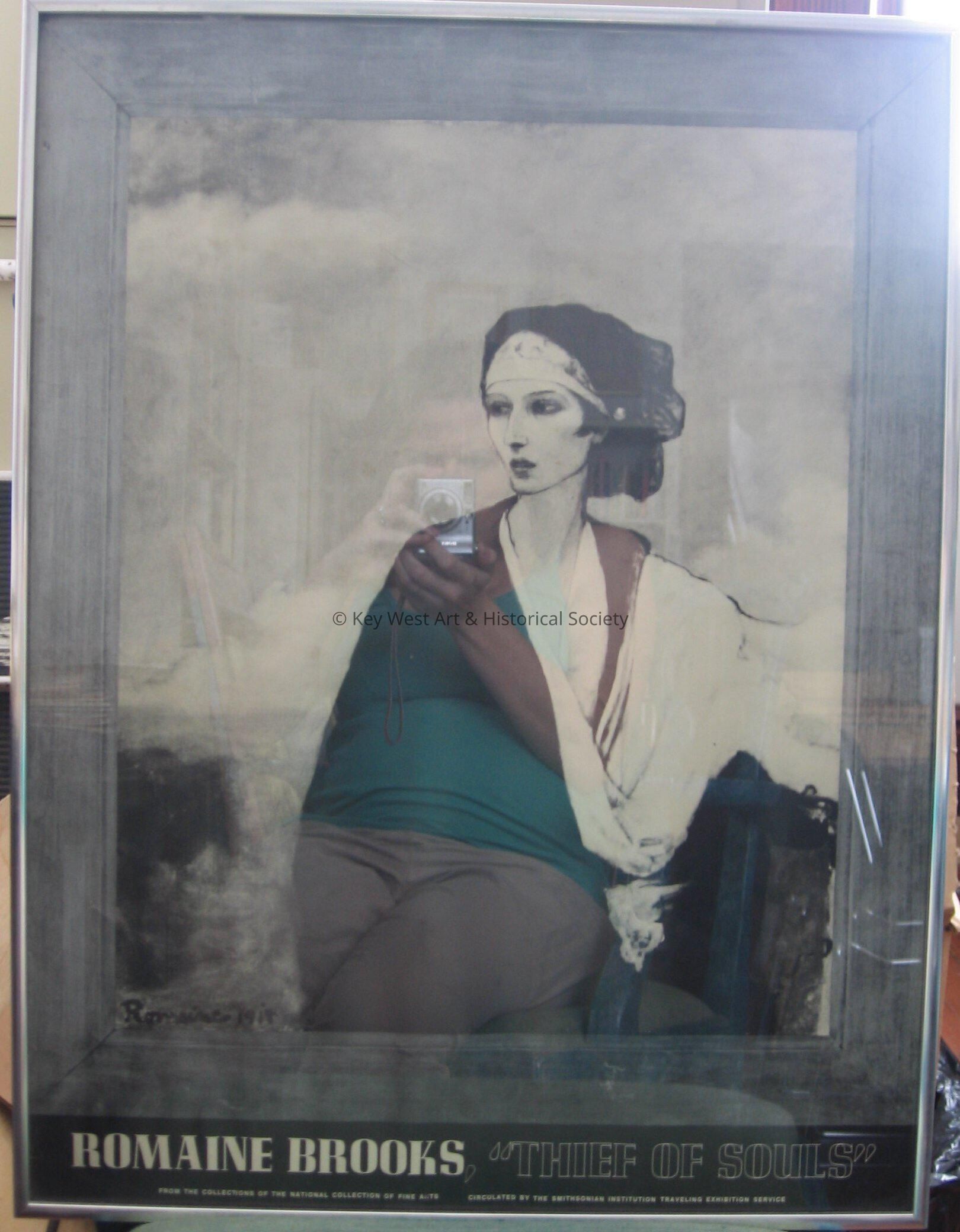 Black and white poster. Image of a woman (Romaine Brooks). Poster reads "Romaine Brooks, "Thief of Souls" "From the collections of the National Collection of Fine Arts. Circulated by the Smithsonian Institution Traveling Exhibition Service". Framed.Collection