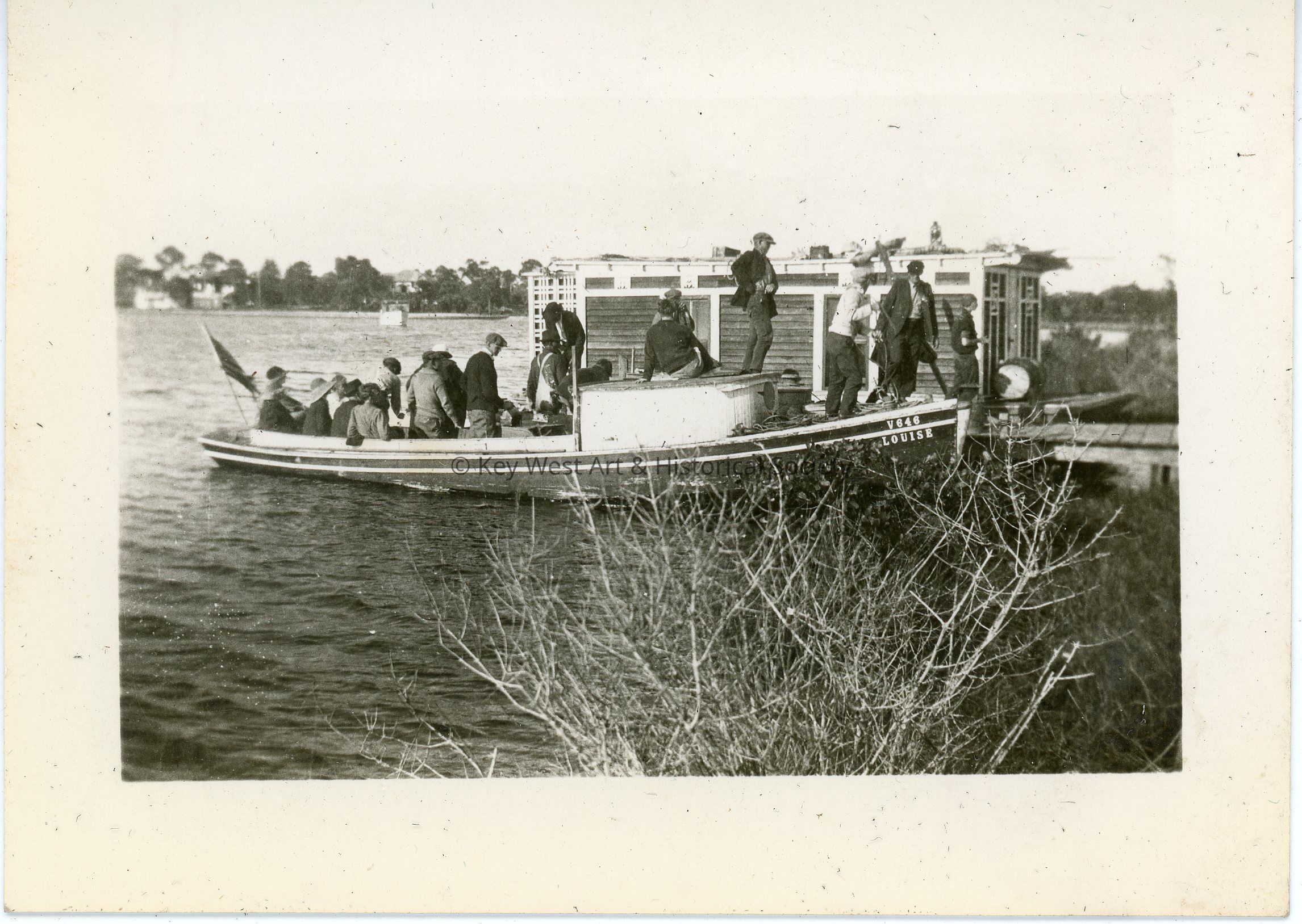 Black and white photograph of a vessel named "Louise" with many passengers at a dock. The photo was part of a photograph album began by Victor H. Baker in 1940.