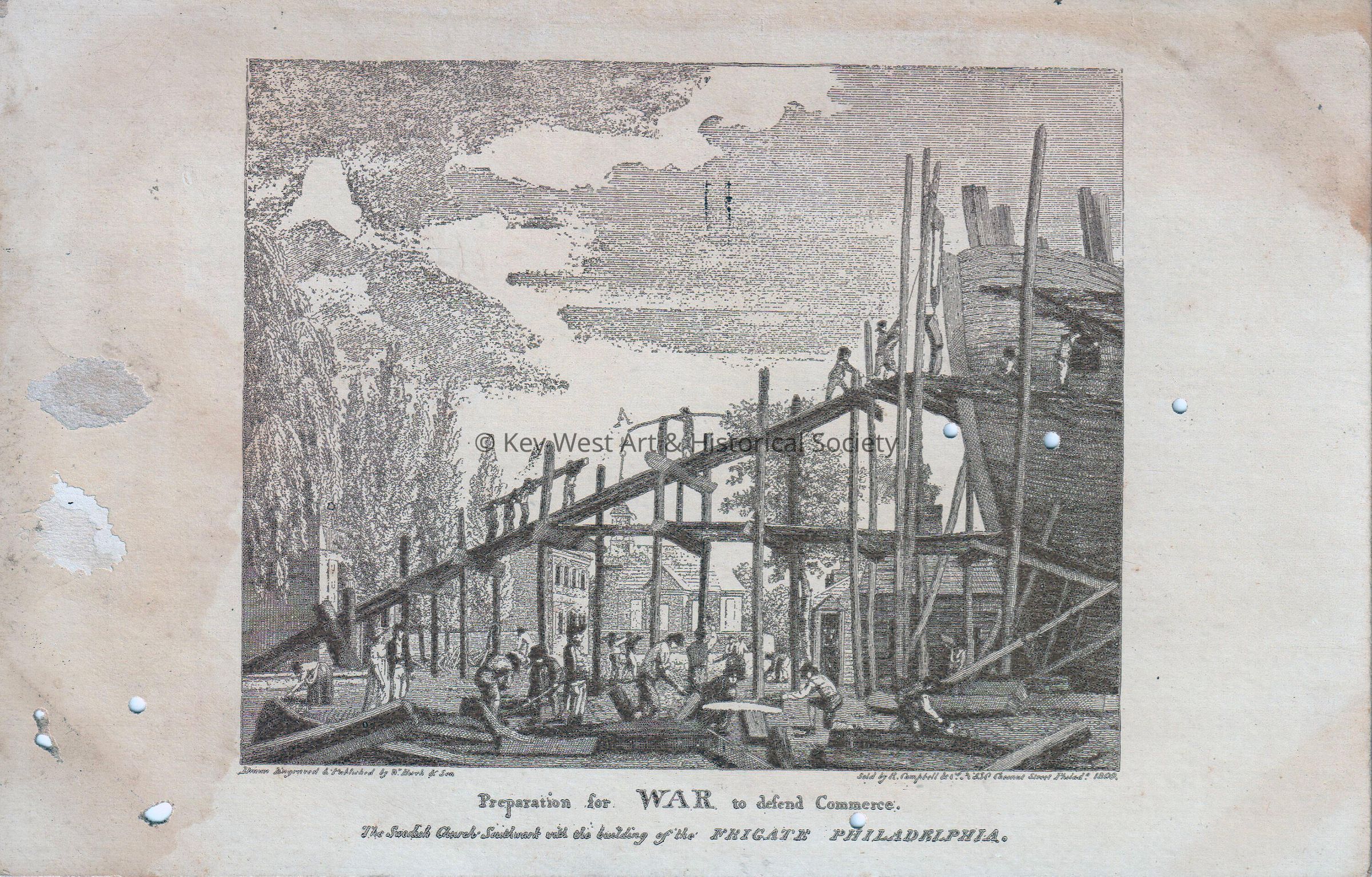 Postcard depicting men building a wooden ship. The caption reads, ‘Preparation for War to defend Commerce. The Swedish Church Southwark and the building of the Frigate “Philadelphia”.’ The description on the verso reads, ‘1799. Founders’ Week Official Post Card.’Collection