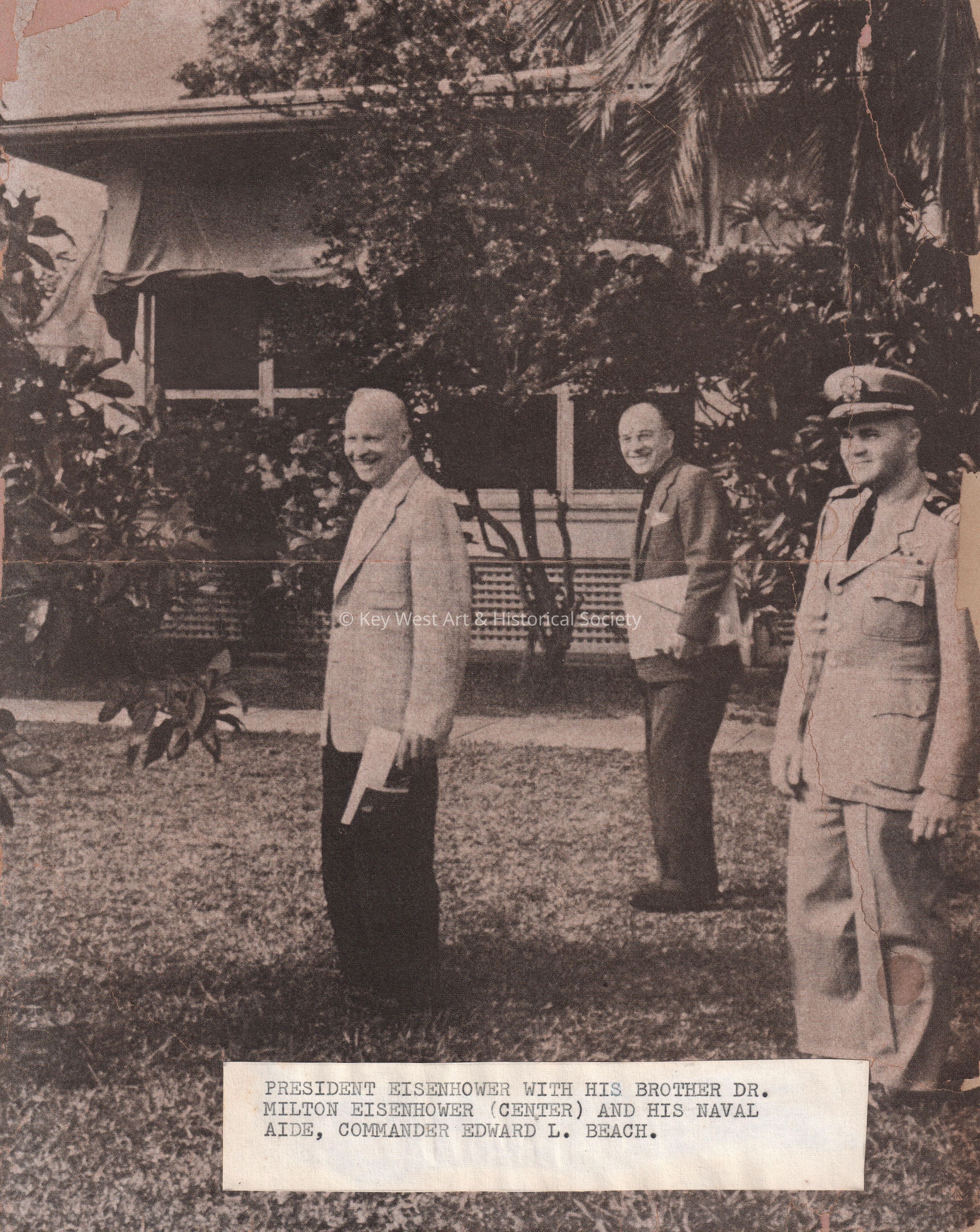 Black and white photograph of President Dwight D. Eisenhower (left), his brother Dr. Milton Eisenhower (center) and his Naval Aide, Commander Edward L. Beach (right).Photograph Details