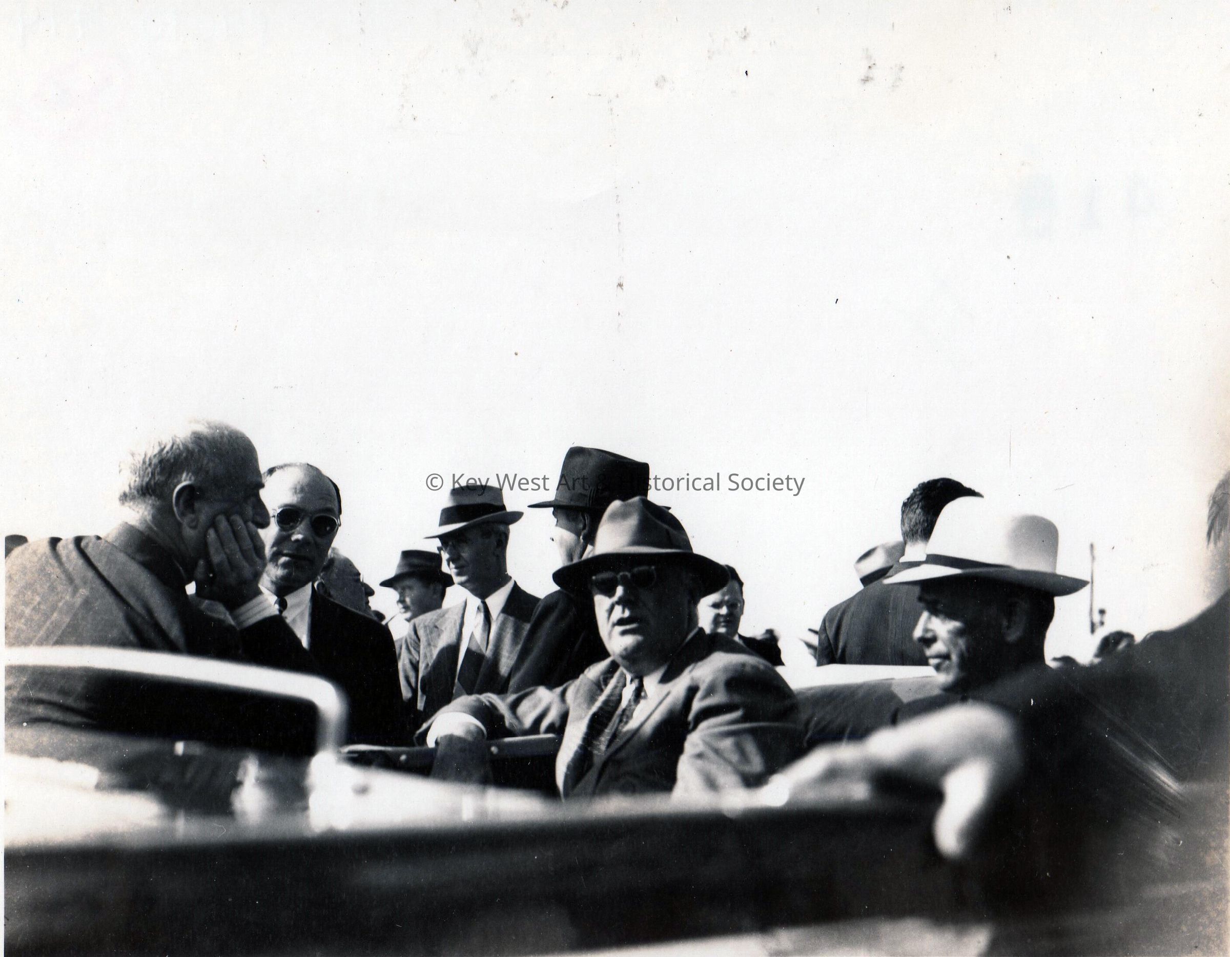 Black and white photograph of US President Franklin D. Roosevelt in a motorcade in Key West following his trip down the Overseas Highway.Photograph Details