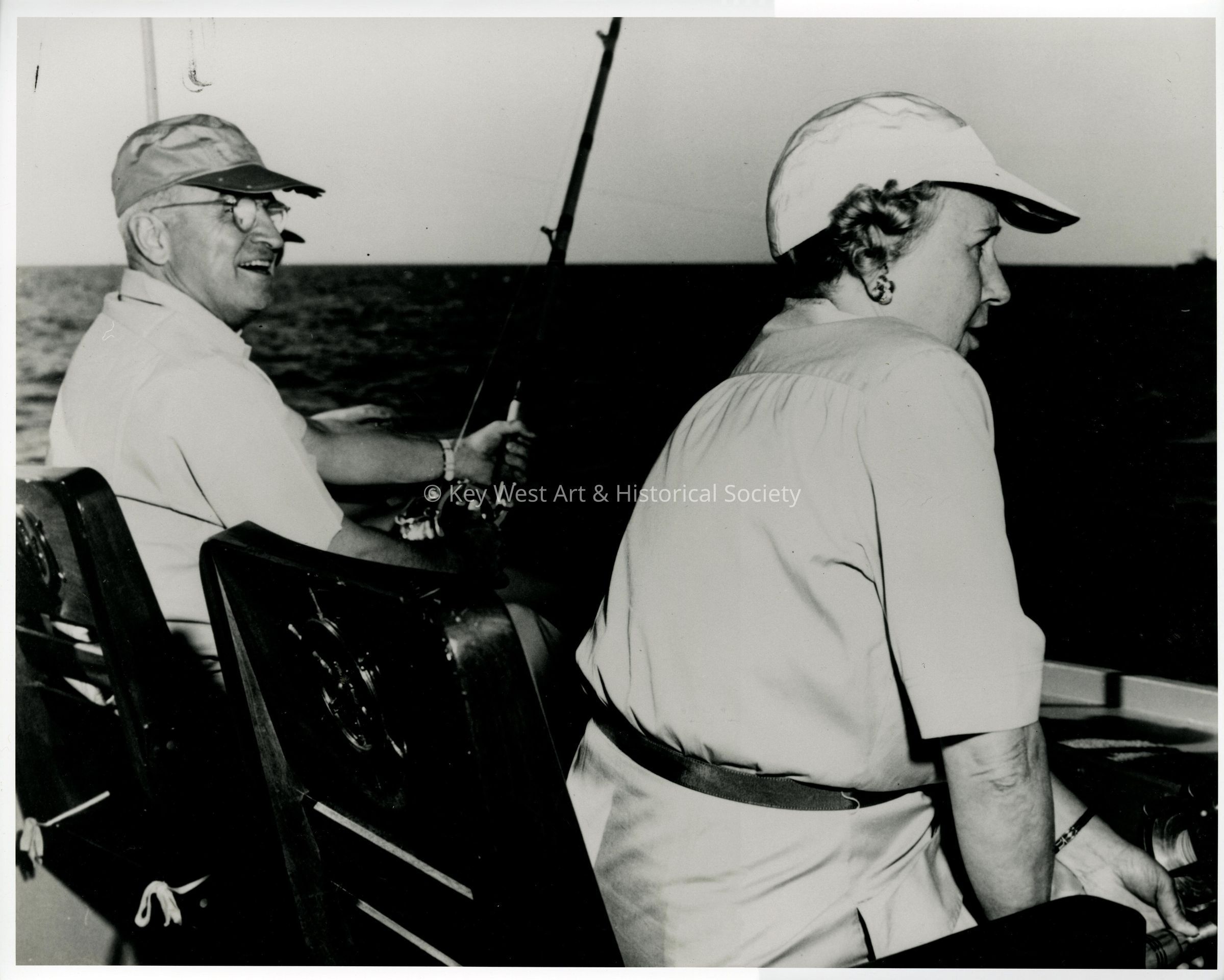 Black and white photograph of U.S. President Harry S Truman and his wife, Bess, fishing in the Florida Keys.