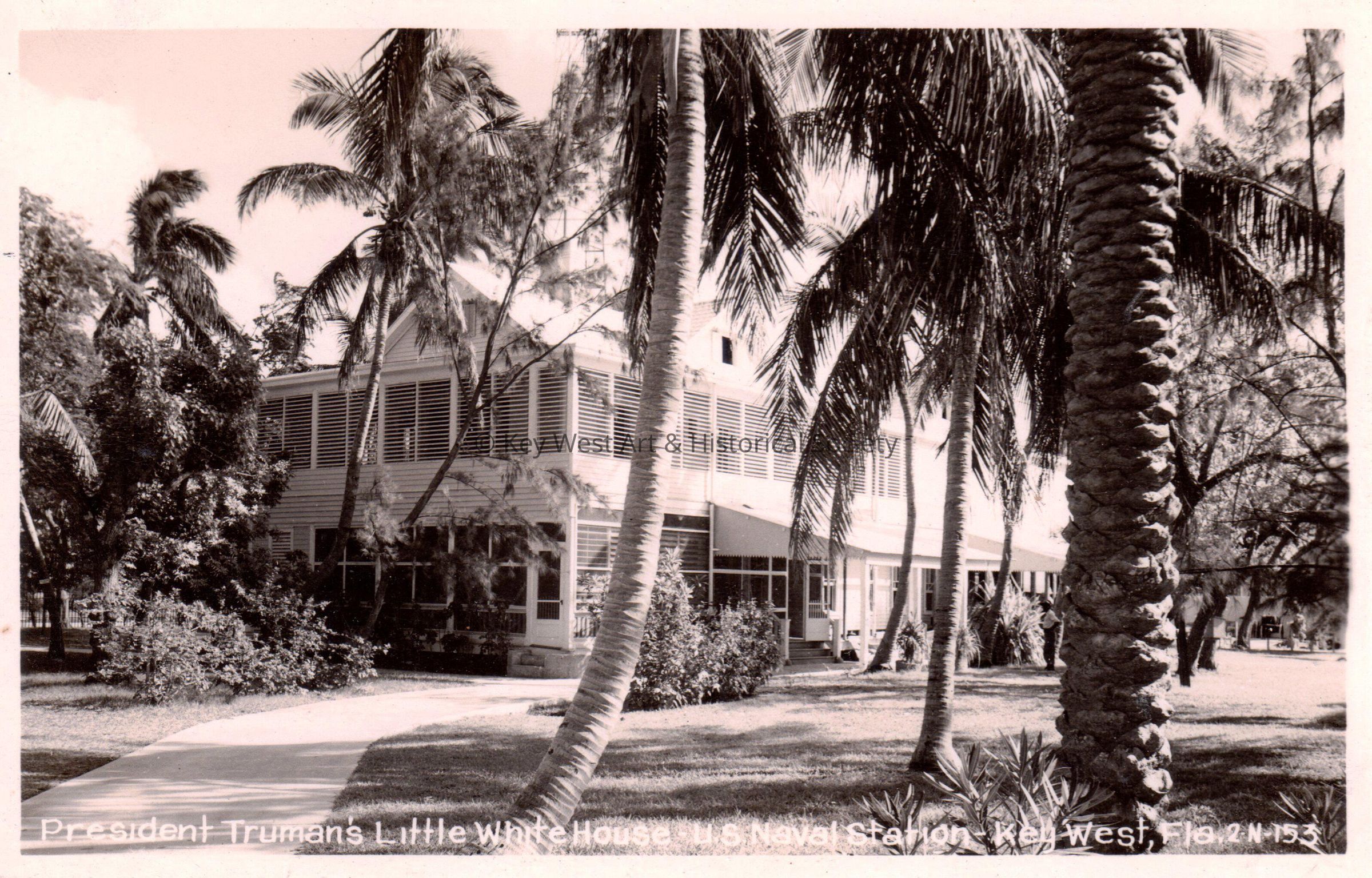 Postcard depicting a house and palm trees. The caption reads, ‘President Truman’s Little White House, U.S. Naval Station, Key West, Florida’.Subject Place
