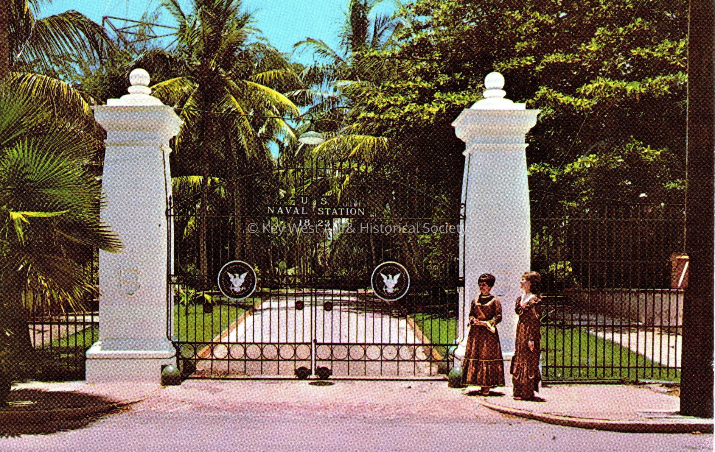 Postcard depicting women in period costumes near gates bearing a sign that reads, US Naval Station,1823’. The description on the verso reads, ‘Presidential Gates. Presidential Gates at Key West. Key West belles in old Key West dress look at the Presidential Gates of the U. S. Naval Station. These gates are open only when a president or other well known dignitary comes to visit Key West Naval Station. Nineteen presidents have visited Key West including Grant, Roosevelt, Truman, Eisenhower and Kennedy. Truman’s famous Little White House is only two blocks through the gates and officers quarters line both sides of the driveway.’Subject Place